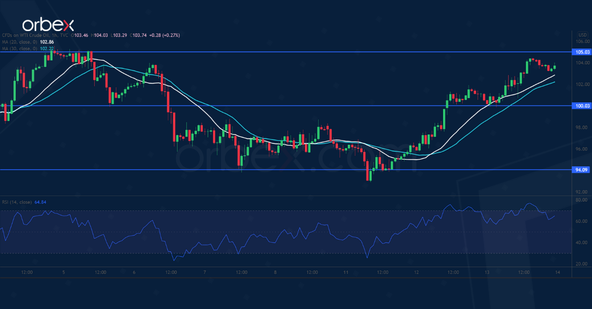 هذا وقد تكون هذه بمثابة مرحلة توطيد بعد جولة الصعود الأخيرة لأسعار النفط. وكان قد أدى التراجع المزدوج لمؤشر القوة النسبية في منطقة ذروة البيع إلى سلوك الشراء عند الانخفاضات. وإذا تمكن خام غرب تكساس من اختراق 105.00، فقد يتبع ذلك ارتداد صاعد أوسع صوب 115.00.