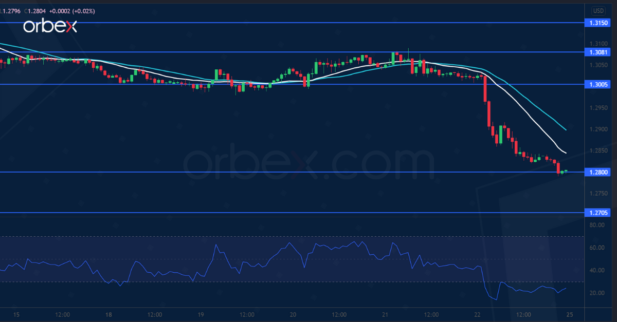 وفي حال كسر الزوج مستوى 1.2800، فسيتجه إلى أدنى مستوياته في سبتمبر 2020 بالقرب من 1.2700. فيما قد ينتج عن ذروة البيع العميق لمؤشر القوة النسبية انتعاشًا محدودًا للزوج. كما قد يتضاعف أتباع الاتجاه للأسفل حول مستوى الدعم والمقاومة عند 1.3000.
