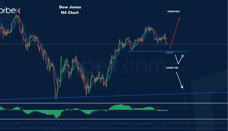 تمكن مؤشر الداو من الانخفاض إلى ما دون الدعم الأول 34800 حيث تمكن من إضافة المزيد من ضغط الهبوط بينما تمكن السوق من اختبار الدعم الثاني حول 34330.