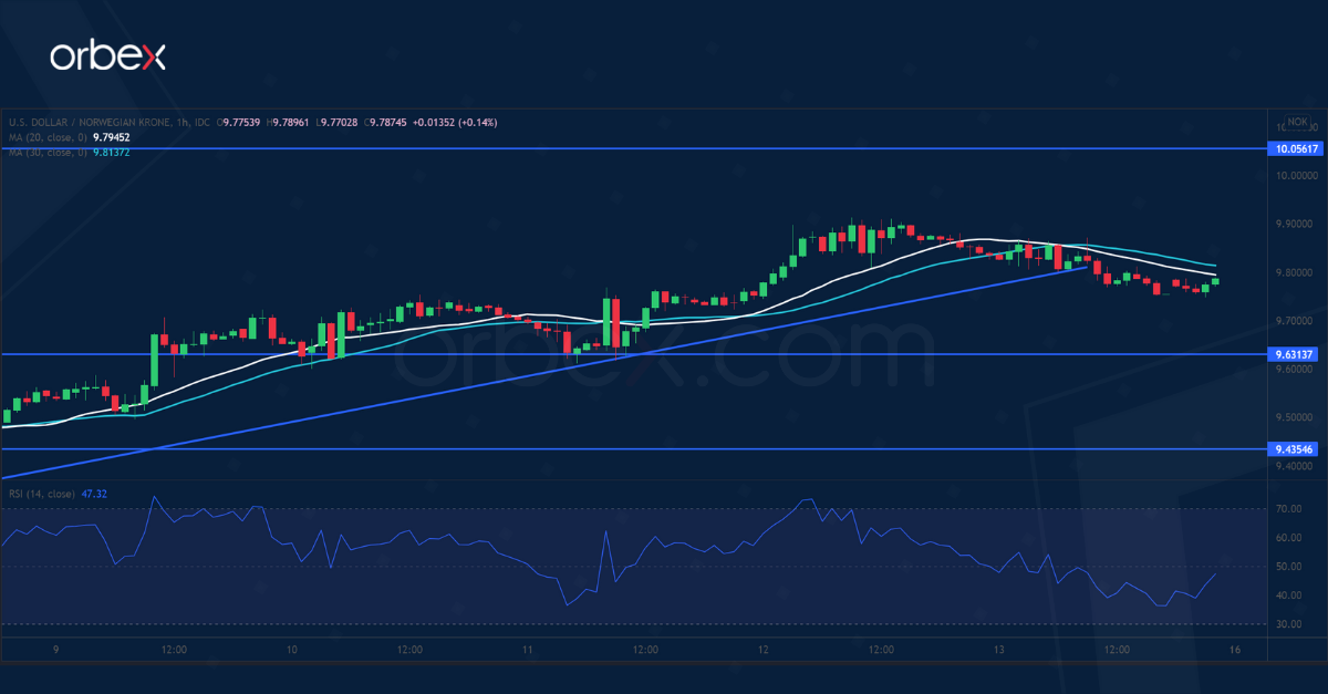 تعوض الكرونة النرويجية خسائرها مع ارتداد أسعار النفط للأعلى. وكان الدولار الأمريكي قد تخطى خط الاتجاه الصاعد بعد الاختراق الإيجابي الذي حققه في أوائل مايو. ولا يزال الشعور العام السائد صاعد بقوة، والآن الزوج في طريقه صوب المستوى النفسي ١٠.٠٠٠٠. إلا أن حالة ذروة الشراء التي يظهرها مؤشر القوة النسبية مراراً فضلاً عن تراجع السعر أدنى خط الاتجاه قد يتسبب في حدوث ارتداد حيث لن يكون المشترون على استعداد لمطاردة عروض الأسعار الأعلى. وتبقى منطقة الطلب قرب ٩.٦٣٠٠ مستوى رئيسي للإبقاء على المعنويات متفائلة على المدى القصير.