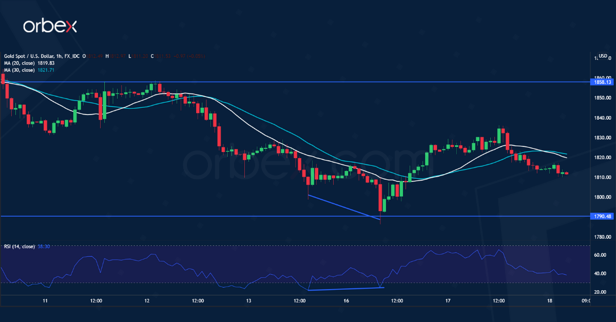 ارتفع الذهب قليلاً بسبب تراجع مؤشر الدولار الأمريكي عن أعلى مستوى له في عقدين. واستقرت حركة السعر بالقرب من ١٧٩٠، وهو أدنى مستويات شهر يناير. ويشير الاختلاف الصاعد لمؤشر القوة النسبية إلى فقدان زخم الهبوط في منطقة الطلب الهامة هذه، ليحث بذلك على شراء الانخفاض. وقد يؤدي جني البائعين أرباحهم في ارتفاع المعدن الثمين. وسيكون الارتداد أعلى ١٨٥٨ كفيلاً بدفع البائعين لتغطية مراكزهم على نطاق واسع. أما على الجانب الهابط، فمن شأن الانخفاض دون المستوى ١٧٩٠، أن يذهب بأسعار الذهب نحو المنطقة السلبية لتكون أدنى مستويات شهر ديسمبر عند ١٧٥٠ هي المحطة التالية.