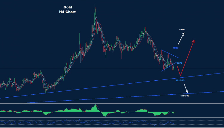 تمكن الذهب من الانخفاض إلى ما دون 1865 يوم أمس بينما لا يزال السوق يحتفظ بالتداولات فوق مستوى الدعم 1850.