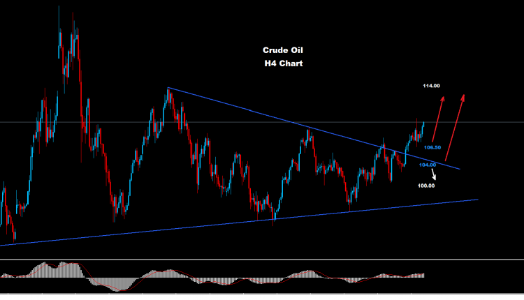 تمكن النفط الخام من الاختراق فوق مستويات 108.00 حيث نصحنا قبل ذلك أنه وفوق هذه المنطقة فأن هناك فرصة لحركة تقدم أكبر نحو 114.00 قد تضرب السوق