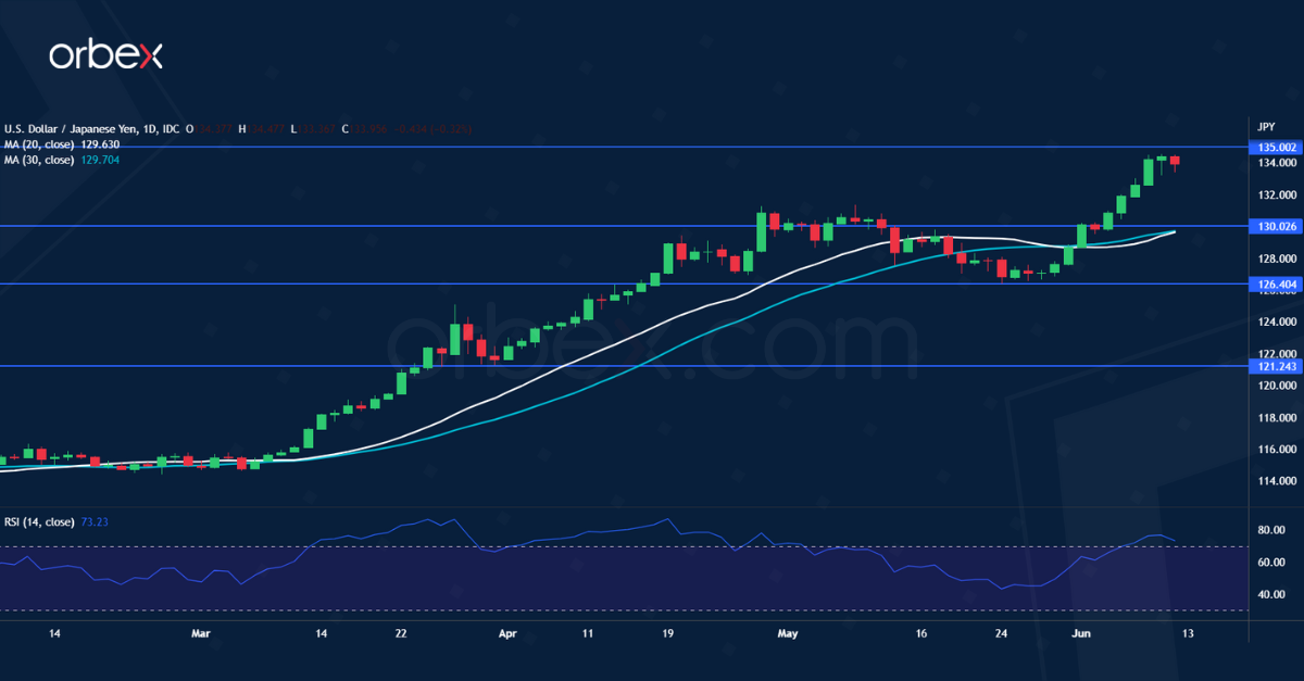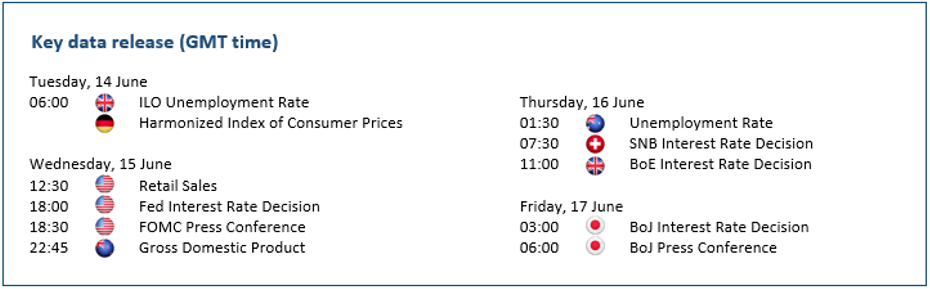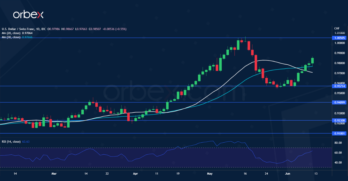 تزداد قوة الدولار الأمريكي مع اقتراب موعد اجتماع مجلس الاحتياطي الفيدرالي المقرر هذا الأسبوع. ومن المتوقع حدوث تذبذبات قوية في أسعار الصرف، حيث من المقرر أن يطرح كلا البنكين المركزيين أحدث توجيهاتهما السياسية. وفي حين أن بنك الاحتياطي الفيدرالي الأمريكي سيعزز اتجاه السوق فيما يتعلق بتشديده القوي، فقد تأتي المفاجأة من جانب البنك الوطني السويسري. فالأسعار السويسرية سجلت في مايو أعلى مستوى لها منذ ١٤ عاماً تقريباً. ويمكن للأساسيات الاقتصادية مع معدل البطالة المنخفض أن يمنح البنك الوطني السويسري مجالاً للتخلي عن أسعار الفائدة السلبية. وفي حال قرر البنك الوطني السويسري مواكبة الاتجاه العالمي للتطبيع، فقد يواجه الزوج ضغوط بيع قوية قرب ١.٠٠٥٠. ويقع الدعم الجديد عند ٠.٩٥٧٠