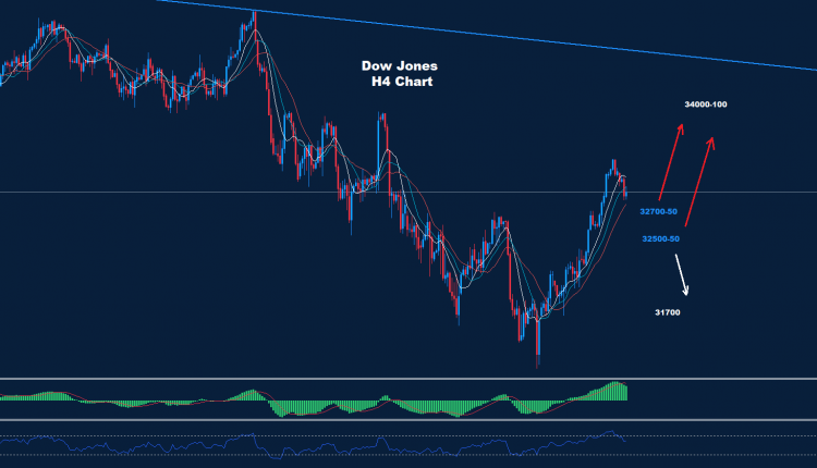 كما نرى على الرسم البياني، تواجه السوق مستويات دعم حول 50-32700 و 50-32500 حيث طالما أن السوق تتداول فوق أحد هذه المستويات ، قد تستمر الموجة المتقدمة نحو منطقة 34000