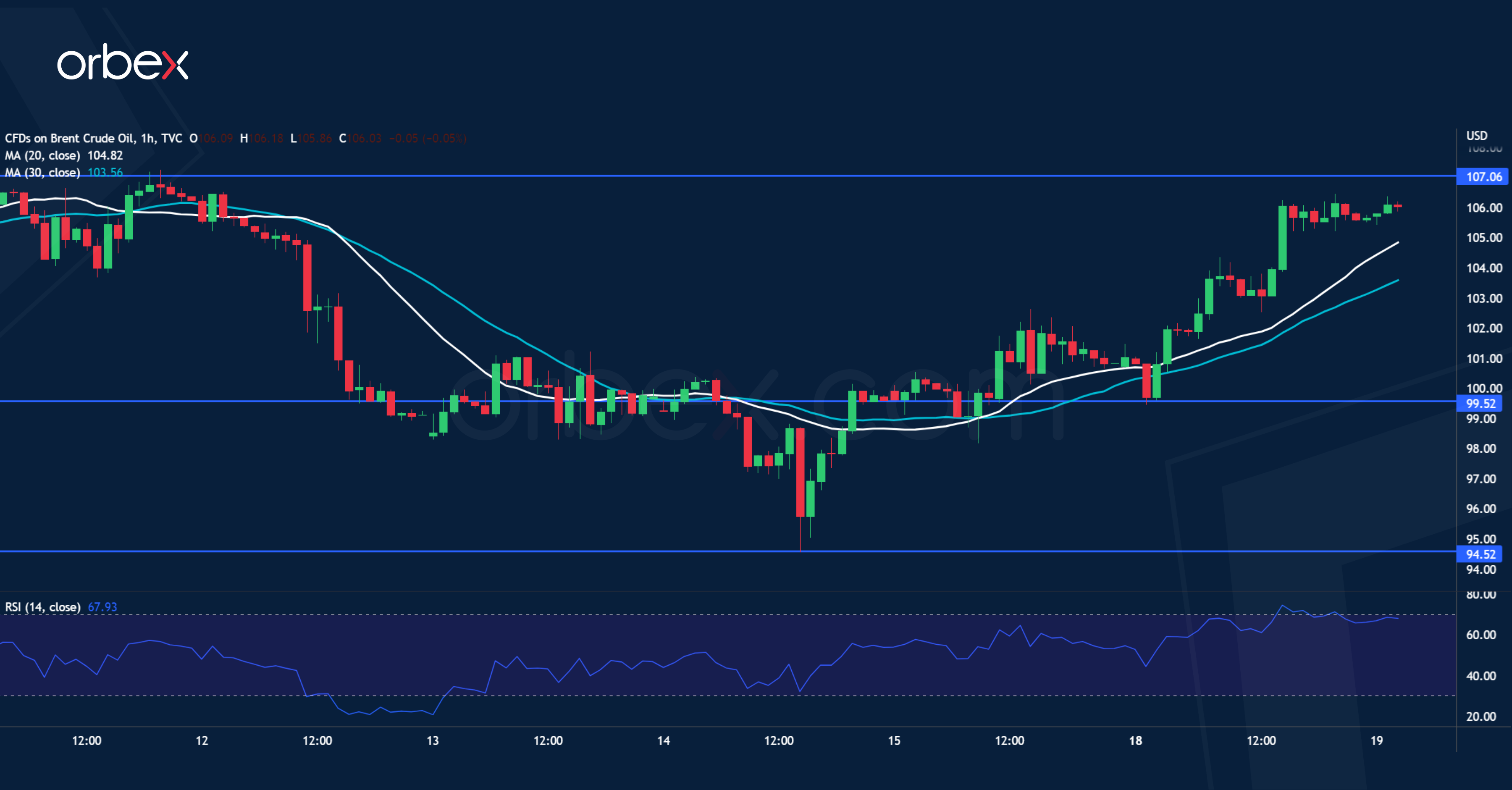 ارتفعت أسواق النفط مع عدم رضوخ المملكة العربية السعودية لضغوط الرئيس الأمريكي “بايدن” بشأن تعزيز المعروض. وكان الانخفاض ما دون المستوى النفسي ١٠٠.٠٠ وتقاطع المتوسط المتحرك السلبي على الرسم البياني اليومي قد أثرا سلباً على الاتجاه الصاعد الذي دام لعامين. وقد يتعرض الارتدادات للضغط مع تحول التحيز نحو الجانب السلبي. وتختبر حركة السعر المستوى ١٠٧.٠٠، الذي قد يؤدي اختراقه إلى تراجع السعر عند ١٠٤.٠٠ منشأ عمليات البيع المكثفة لشهر يوليو، وهو مستوى مقاومة رئيسي. أما الدعم المباشر فيقع عند ٩٩.٥٠، وقد يؤدي التصحيح الأعمق إلى هبوط اسعار خام برنت إلى ما دون ٩٤.٥٠.
