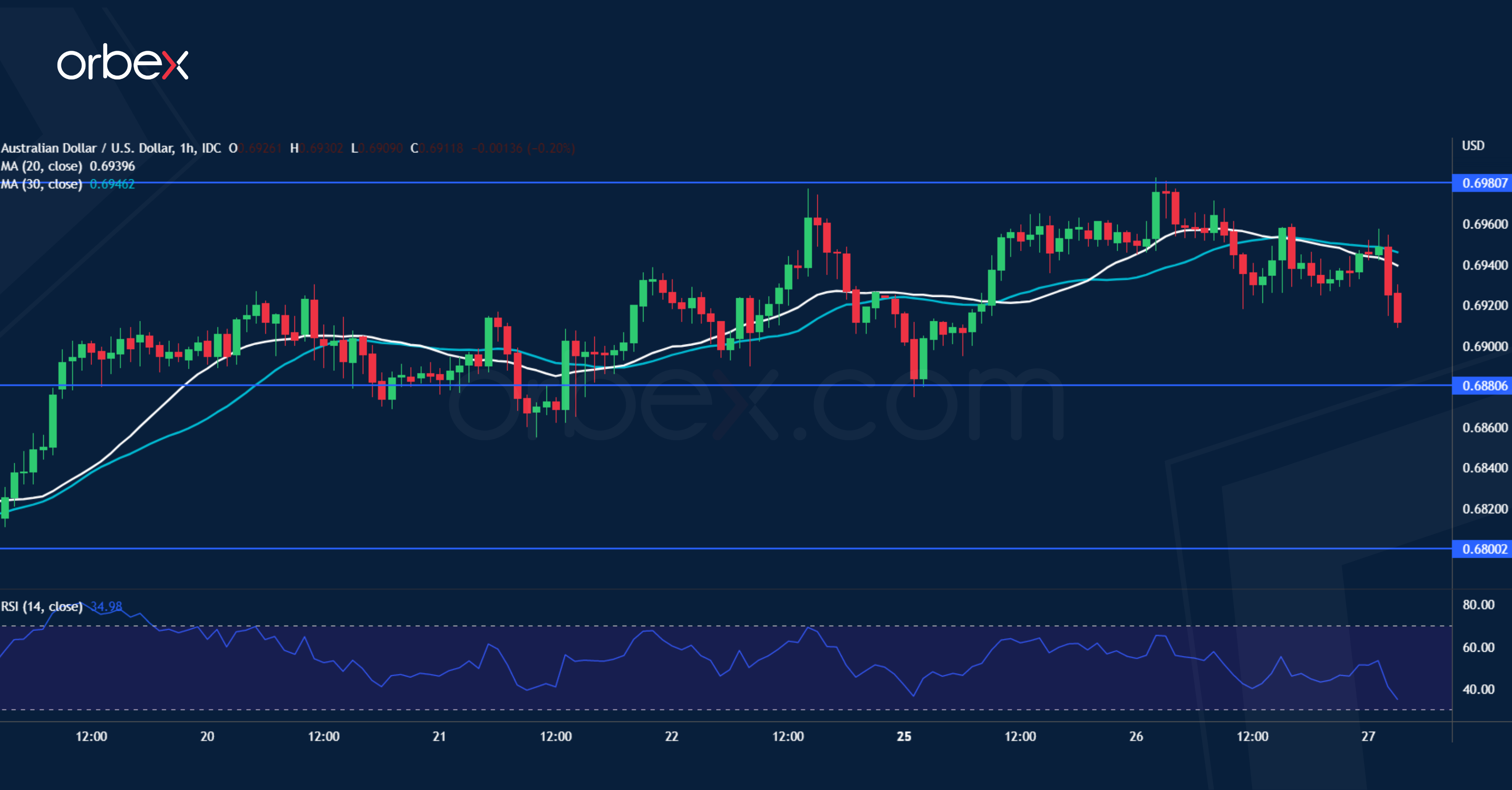 تراجع الدولار الأسترالي أمام نظيره الأمريكي بعد أن جاءت نتائج مؤشر أسعار المستهلكين في الربع الثاني دون التوقعات. وأجبر ارتفاع الزوج أعلى منطقة العرض الواقعة قرب المستوى ٠.٦٩٦٠ مزيد من البائعين على تغطية مراكزهم ما خفف الضغط على الدولار الأسترالي. وتقع المقاومة المباشرة عند ٠.٦٩٨٠، ومن شأن اختراقها أن يوسع نطاق الارتفاع ليصل بالزوج أعلى المقاومة اليومية عند ٠.٧٠٦٠. ولكن يتعين أولاً على الزوج تعزيز مكاسبه الأخيرة لزيادة الزخم. هذا ويقع الدعم الجديد عند ٠.٦٨٨٠. وفي حال تراجع الزوج أكثر، فإن المستوى ٠.٦٨٠٠ عند قاعدة الاختراق يعد مستوى رئيسي للحفاظ على الارتداد الحالي قائماً.
