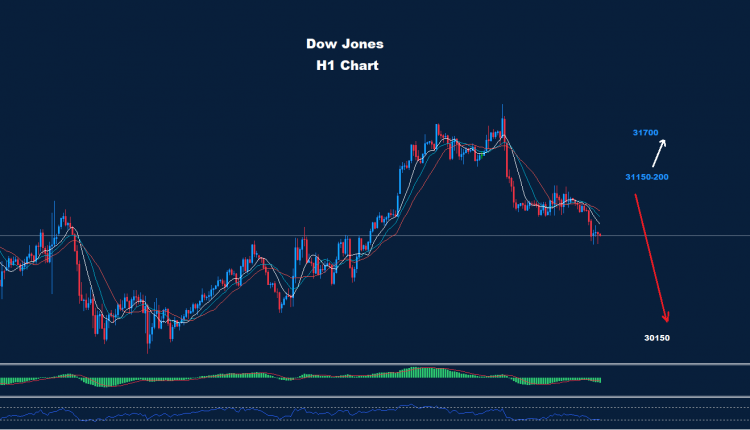 يواجه مؤشر الداو جونز منطقة مقاومة حول 200-31150 حيث طالما استمر السوق في الحفاظ على التداولات أسفله ، فمن المتوقع حدوث مزيد من الانخفاض نحو منطقة 200-30150 وما دونها