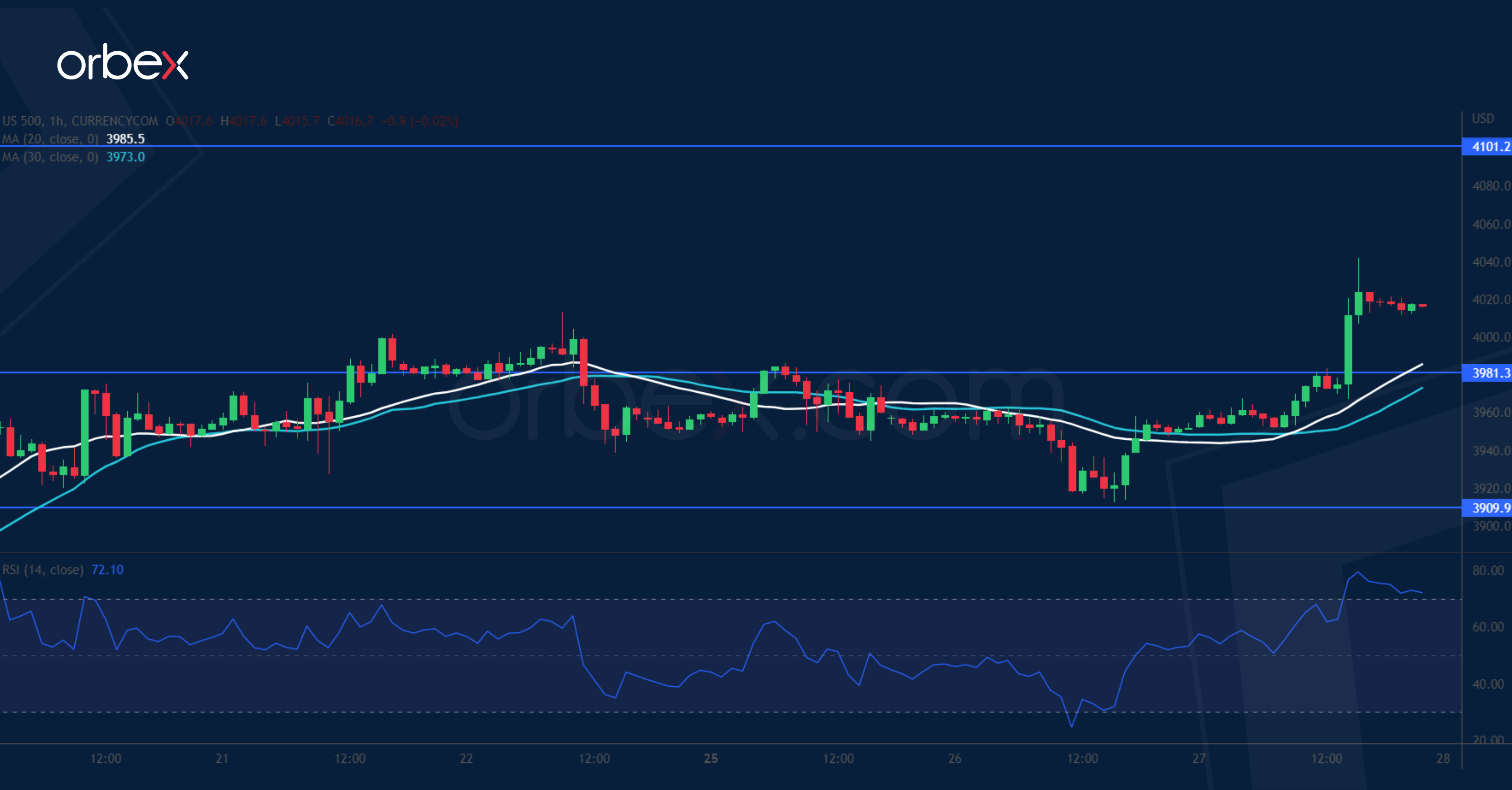 ارتفع مؤشر “ستاندرد أند بورز ٥٠٠” مع تخلي بنك الاحتياطي الفيدرالي عن الخيار المروع المتمثل في رفع سعر الفائدة بنسبة مئوية كاملة في الوقت الحالي. ومن منظور الرسم البياني اليومي، فإن مزاج السوق يشوبه الحذر على أحسن تقدير. بيد أنه قد لا يزال هناك مجال لحدوث ارتداد على المدى القصير. وقد عزز المؤشر من مكاسبه أعلى المستوى ٣٩١٠. ويحتمل أن يزيد الإغلاق أعلى المستوى النفسي ٤٠٠٠ من زخم الشراء، ويعود بالسعر إلى حيث بدأت عمليات البيع المكثفة في شهر يونيو عند ٤١٠٠. ومع دخول مؤشر القوة النسبية إلى منطقة ذروة الشراء، فإن قاعدة الاختراق عند ٣٩٨٠، تعد هي أول مستوى دعم في حال حدوث ارتداد.