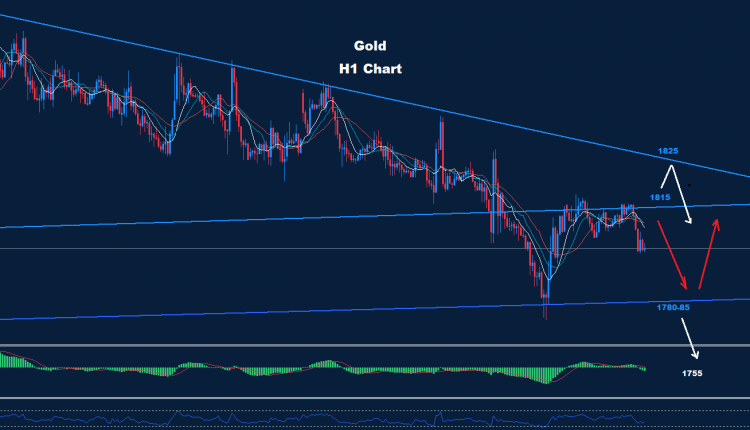 كما نرى على الرسم البياني خلال اليوم ، يواجه السوق مقاومات حول 1815 و 1825 حيث قد يستمر ضغط الاتجاه الهبوطي طالما استمر الذهب في الاحتفاظ بالتداولات أدنى من تلك المقاومة للتوجه مرة أخرى لاختبار الدعم 85-1780