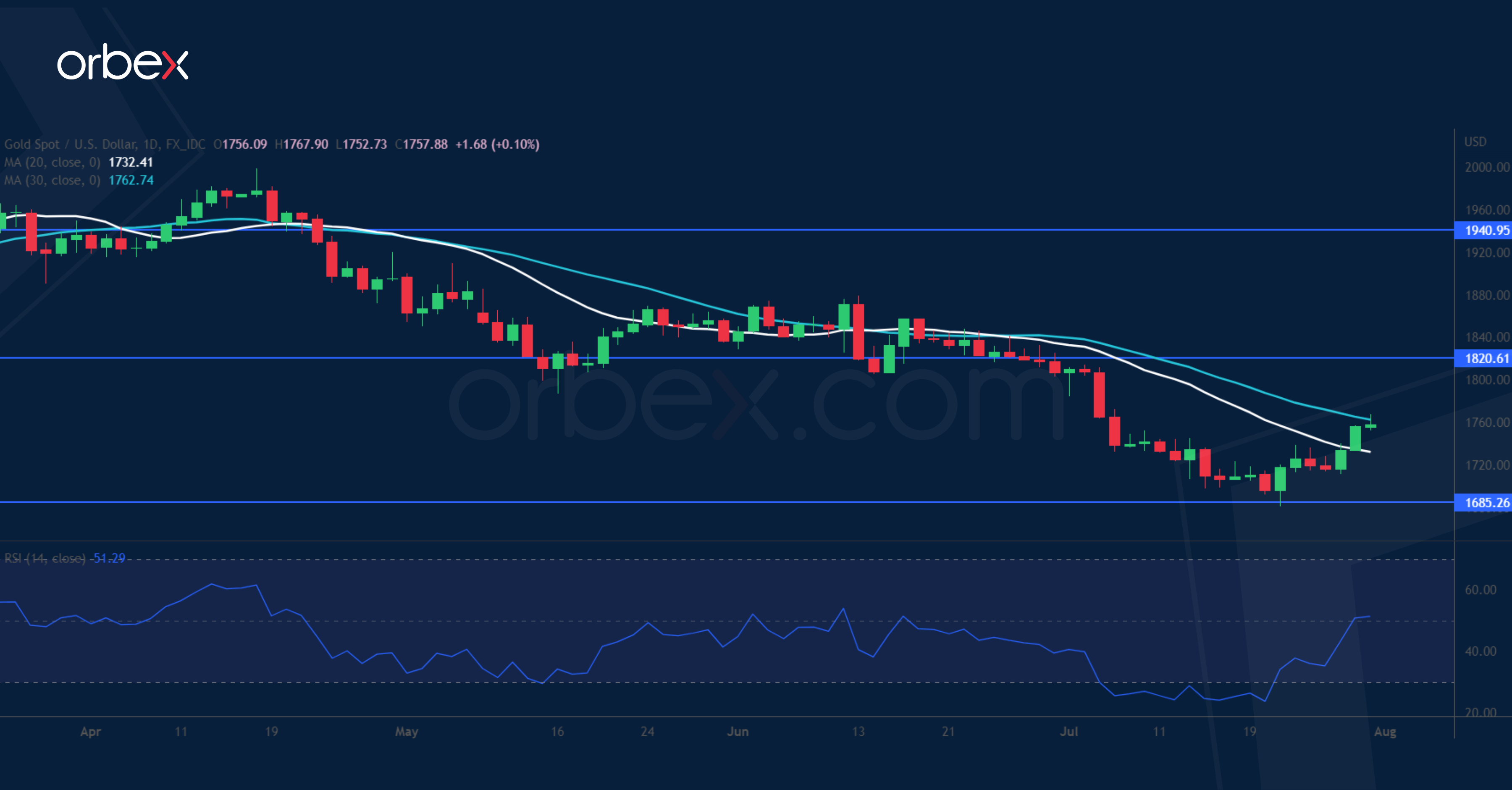 يعوض الذهب خسائره مع تراجع الدولار الأمريكي بعد تراجع حدة نبرة بنك الاحتياطي الفيدرالي. وقرر رئيس الفيدرالي “باول” ألا يفصح عن خطوته التالية، حيث يتوقف القرار على نتائج البيانات الاقتصادية. وكان الاقتصاد الأمريكي قد انكمش بشكل غير متوقع بنسبة ٠.٩٪ في الربع الثاني، مما عزز المخاوف حول اقتراب الركود. ما يهتم به السوق في الواقع هو ما إذا ما كان في مقدرة الاحتياطي الفيدرالي التحكم في نسب التباطؤ الاقتصادي والذي من شأنه أن يقنعهم بوقف رفع الفائدة. وأدى هذا الاحتمال إلى تخلي المتداولين عن مراكزهم الشرائية للدولار في تداول الزخم. واكتسب الذهب الزخم بعد أن ارتد عن ١٦٨٥ ليتجه نحو ١٨٢٠.