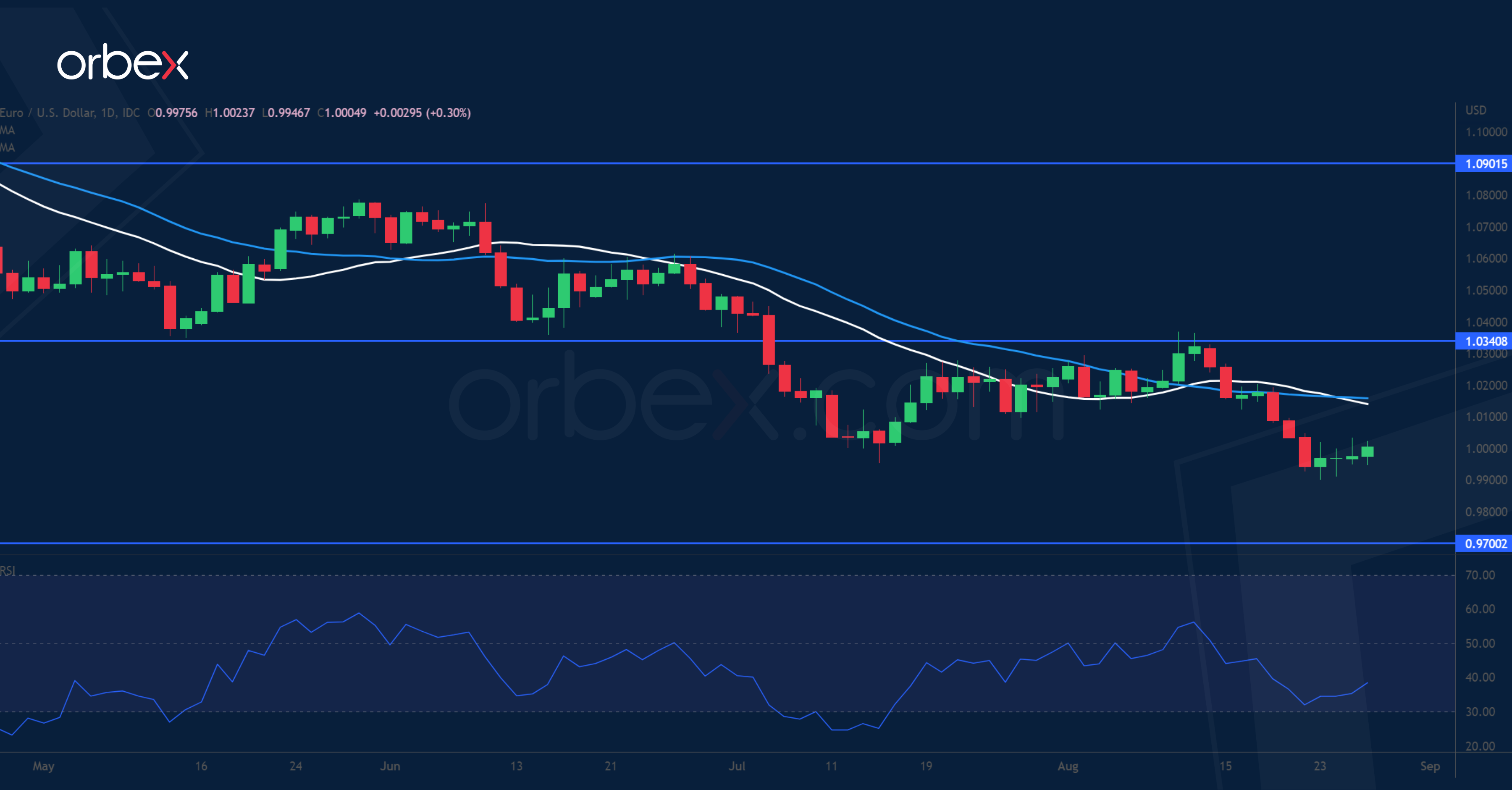 لا يزال الدولار الأمريكي قوياً بسبب احتمالية استمرار الفيدرالي برفع أسعار الفائدة. والواقع أن فشل اليورو في الدفاع عن مستوى التكافؤ كشف عن انعدام الثقة في النظرة المستقبلية لأوروبا. وقد يستمر المزاج المتشائم إلى حد كبير في خفض العملة الموحدة، وقد يكون التعزيز الأخير مجرد توقف مؤقت فيما يبحث مشترو الدولار الأمريكي عن محفزات للدفع للعودة. وعلى الجانب الآخر، فقد تضاءلت الآمال في أن يؤدي التباطؤ الاقتصادي إلى تغيير أجندة تشديد بنك الاحتياطي الفيدرالي. وتشير أسواق العقود الآجلة إلى أن المتداولين رفعوا رهاناتهم على رفع الفائدة بمقدار ٧٥ نقطة أساس في سبتمبر، مما قد يهبط بالزوج إلى أدنى مستوى له في ٢٠ عاماً عند ٠.٩٧٠٠، وتقع المقاومة عند ١.٠٣٤٠.