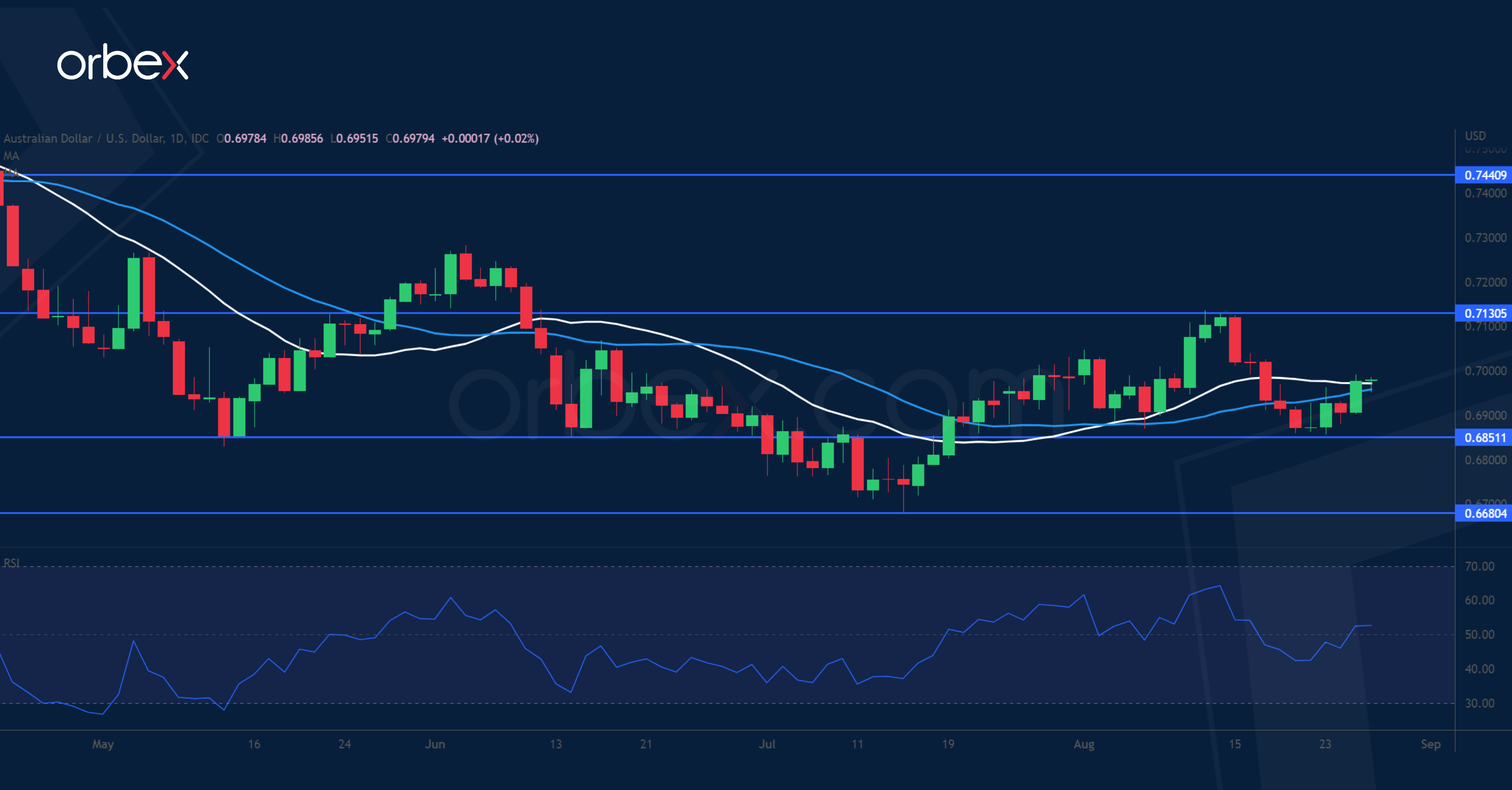 يتراجع الدولار الأسترالي مع ابتعاد الأسواق عن المخاطرة. إذ تراجعت الرغبة في المخاطرة في أعقاب التصريحات المتشددة من مسؤولي الاحتياطي الفيدرالي الأمريكي. وفي الوقت نفسه، تواجه العملة المرتبطة بالسلع الأساسية، باعتبارها وكيلا للاقتصاد الصيني، رياحاً معاكسة إضافية. وتسعى بكين إلى تحقيق الاستقرار في سوق العقارات المتعثر، حيث خفض بنكها المركزي أسعار الفائدة لدعم الاقتصاد في أعقاب البيانات المخيبة للآمال. وقد تؤدي بيانات التجزئة الأسترالية إلى إثارة التقلبات على المدى القصير، ولكن قد تستمر معنويات السوق العامة في التحكم بسعر الصرف بدلاً من الأساسيات المحلية. وقد وصل الزوج لمستوى المقاومة عند ٠.٧١٣٠، أما الدعم الرئيسي فيقع عند ٠.٦٨٥٠.