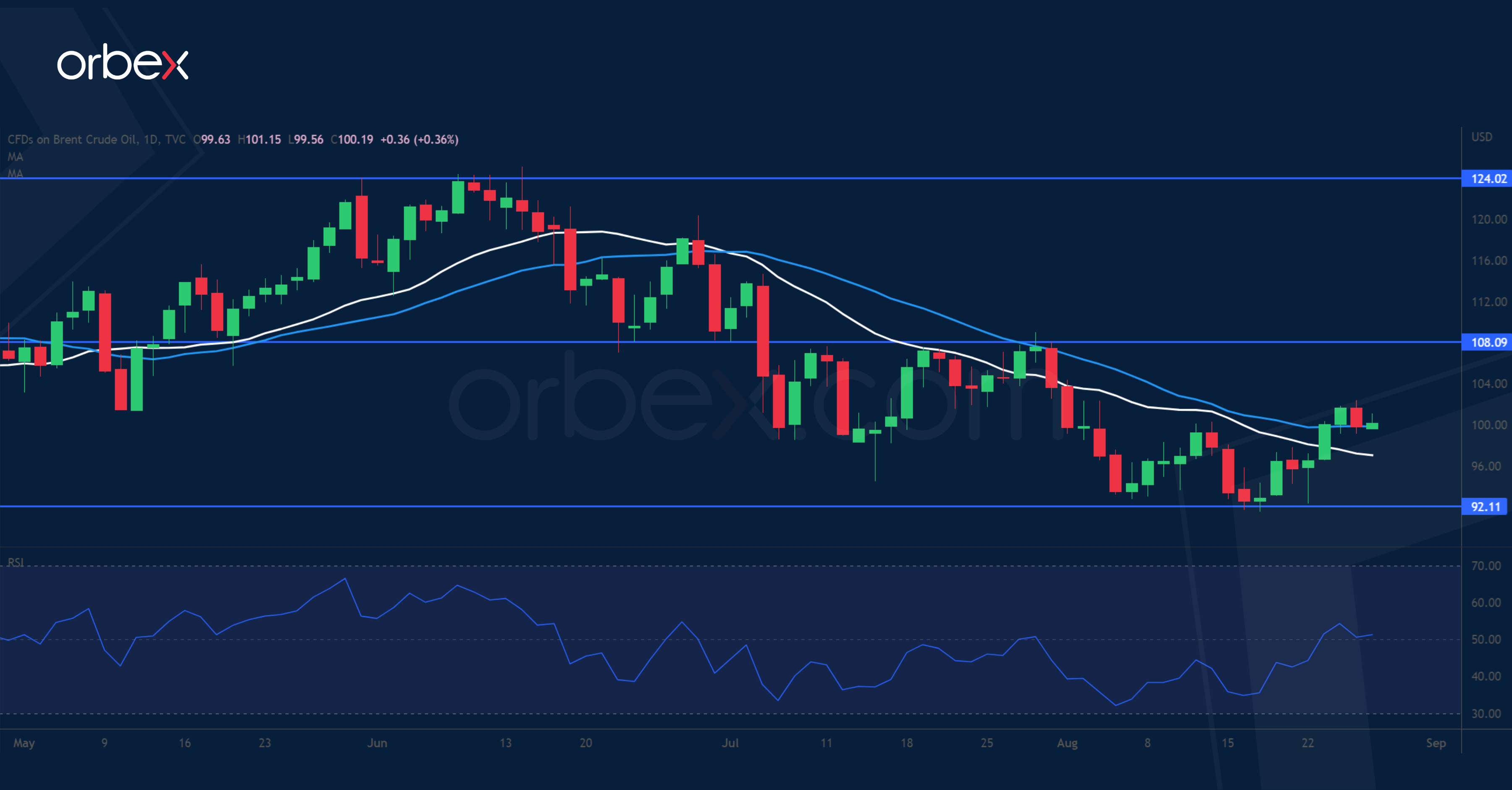 يعوض خام برنت خسائره، حيث قد تخفض أوبك+ الإنتاج لحماية الأسعار. وفي الوقت الذي تسعى فيه إيران إلى حل وسط في اتفاقها النووي، يبدو أن الاتفاق صعب التحقق ولكنه ليس مستحيلًا. وقد تؤدي عودة النفط الإيراني إلى الأسواق إلى تقويض الموردين الرئيسيين، واقترحت المملكة العربية السعودية أن تنظر أوبك+ في خفض الإنتاج رداً على ذلك. ويوفر التراجع الأكبر من المتوقع في المخزونات الأمريكية مزيداً من الرياح المعاكسة للانتعاش. أما الآن، فإن احتمال وجود إمدادات خاضعة لرقابة مشددة قد يفوق المخاوف من أن التباطؤ الاقتصادي في الصين قد يعوق الطلب. ولاقى السعر دعماً عند ٩٢.٠٠ ويتطلع إلى استعادة المستوى ١٠٨.٠٠.