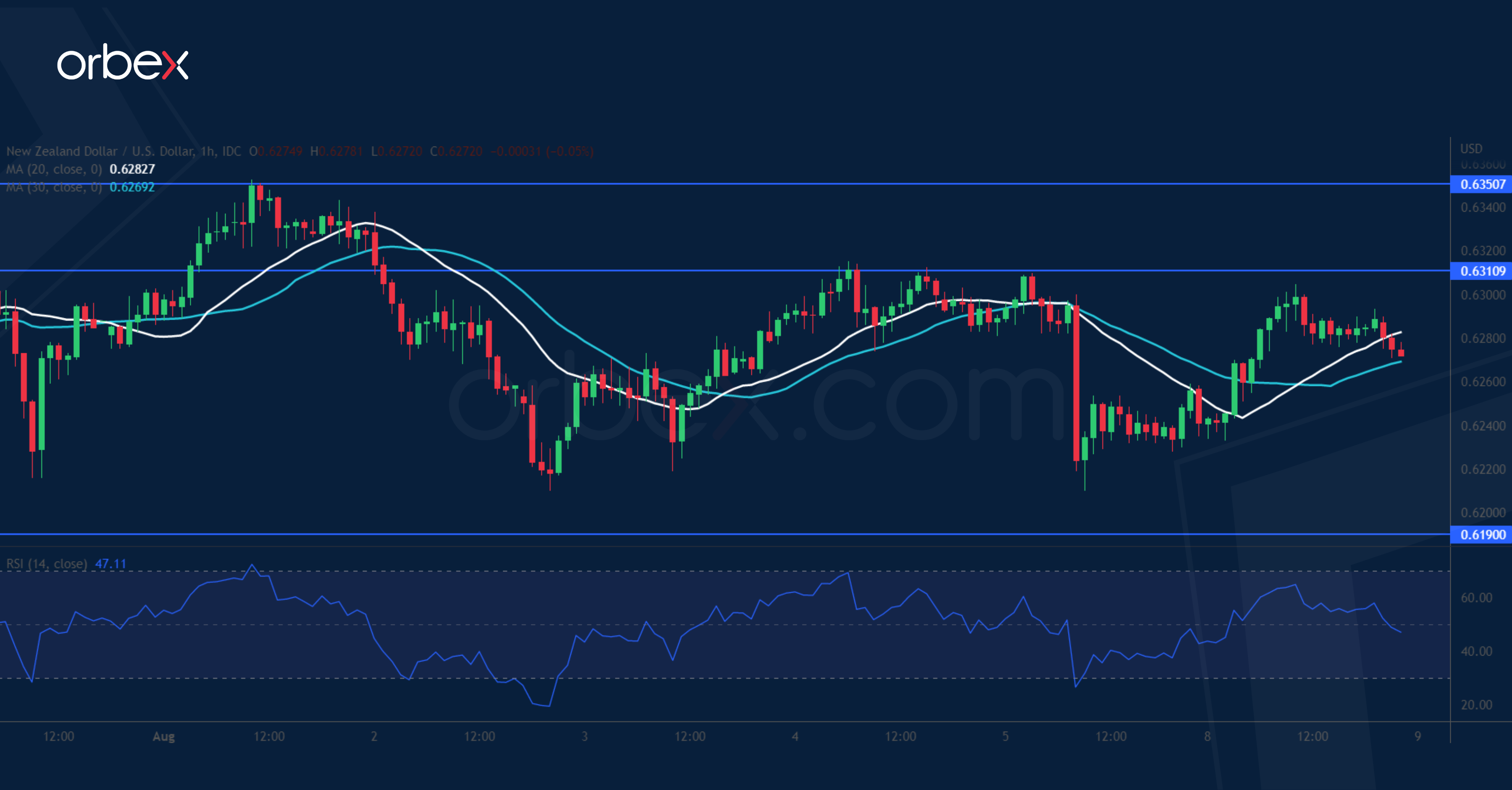 يفقد الدولار النيوزيلندي قوته بعد تباطؤ توقعات التضخم. وبات السعر عند مفترق طرق بعد أن توقف الارتفاع الأخير في منطقة العرض ٠.٦٣٥٠، في حين أن تقاطع المتوسط المتحرك الصاعد على الرسم البياني اليومي قد يجذب المزيد من الراغبين بالشراء. وقد يؤدي الارتفاع أعلى ٠.٦٣١٠ والعقبة المذكورة إلى دفع الدولار النيوزيلندي صوب قمة يونيو عند ٠.٦٥٦٠، مما يخفف الضغط السلبي على المدى المتوسط. ويعتبر ٠.٦١٩٠ دعماً رئيسياً حيث يتطلع المشترون لتعزيز مكاسبهم. ومع مزيد من الهبوط، يعتبر ٠.٦١٢٠ دعماً جوهرياً يتوجب صموده للحفاظ على الارتداد الحالي قائماً.