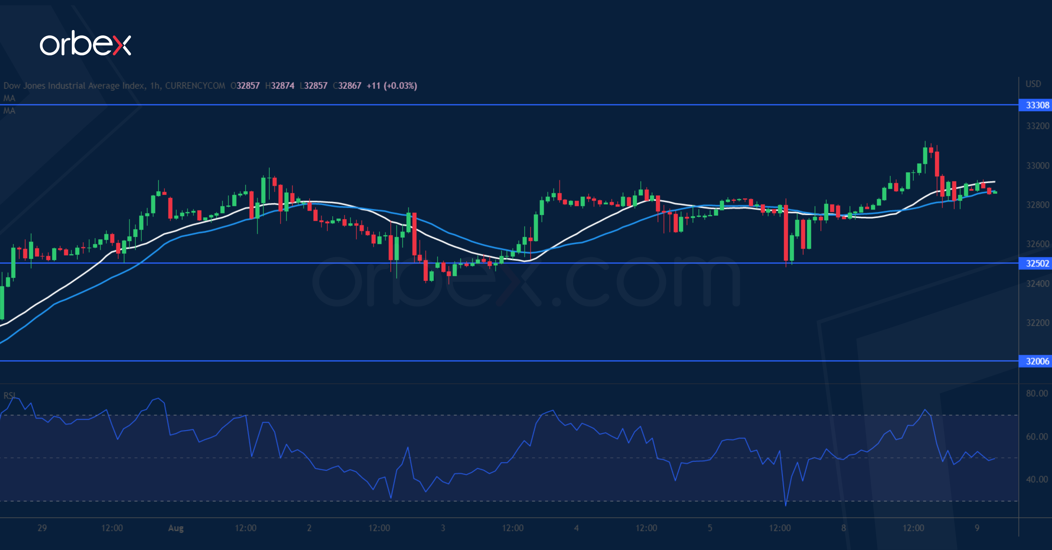 يتماسك مؤشر “داو جونز ٣٠” دون إحراز تقدم ملحوظ كون أن بيانات الوظائف الأمريكية القوية قد تدعم التشديد القوي. ووجد المؤشر طلبات شراء أعلى ٣٢٥٠٠. ويعد أعلى مستوى في يونيو عند ٣٣٣٠٠ مقاومة رئيسية. وقد تتسبب حالة ذروة الشراء المتكررة لمؤشر القوة النسبية في حدوث تراجع حيث يتزامن جني الأرباح مع عمليات بيع جديدة في منطقة العرض. وقد يؤدي الاختراق الصاعد إلى شراء زخم وإخراج عدد كبير من البائعين على المدى المتوسط، مما سيمهد الطريق لانتعاش ممتد في الأسابيع القادمة. وقد يؤدي الانخفاض إلى ما دون ٣٢٥٠٠ إلى تصحيح نحو ٣٢٠٠٠.
