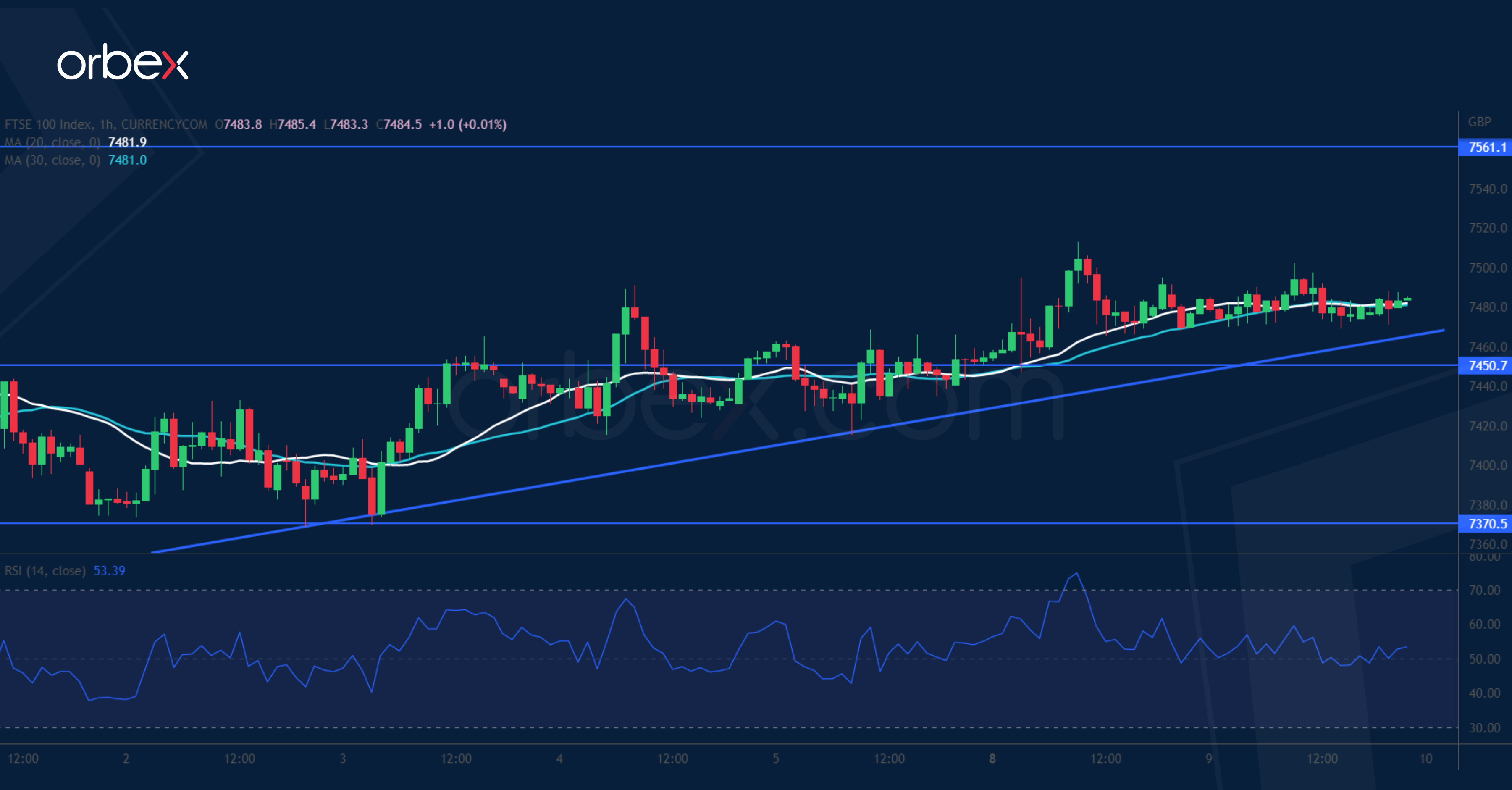 ارتفع مؤشر “فوتسي ١٠٠” مدعوماً بأسهم المال والسلع. ويظهر التقاطع الإيجابي للمتوسط المتحرك على الرسم البياني اليومي تسارعاً في وتيرة الارتفاع. ومع تجاوز المؤشر لخط الاتجاه الصاعد، فمن المرجح أن يجذب التفاؤل المزيد من الراغبين بالشراء. ويعد المستوى ٧٥٦٠ في بداية عمليات البيع المكثفة لشهر يونيو بمثابة مقاومة رئيسية حيث قد يعاني المؤشر عندها بسبب ضغط عمليات جني الأرباح وصفقات البيع الجديد. ومع ذلك، إذا ما نجح المشترين في تجاوز القمة الثلاثية عند ٧٦٥٠، فيمكنهم استئناف الارتفاع على المدى المتوسط. ويعتبر المستوى ٧٤٥٠ دعماً هاماً.