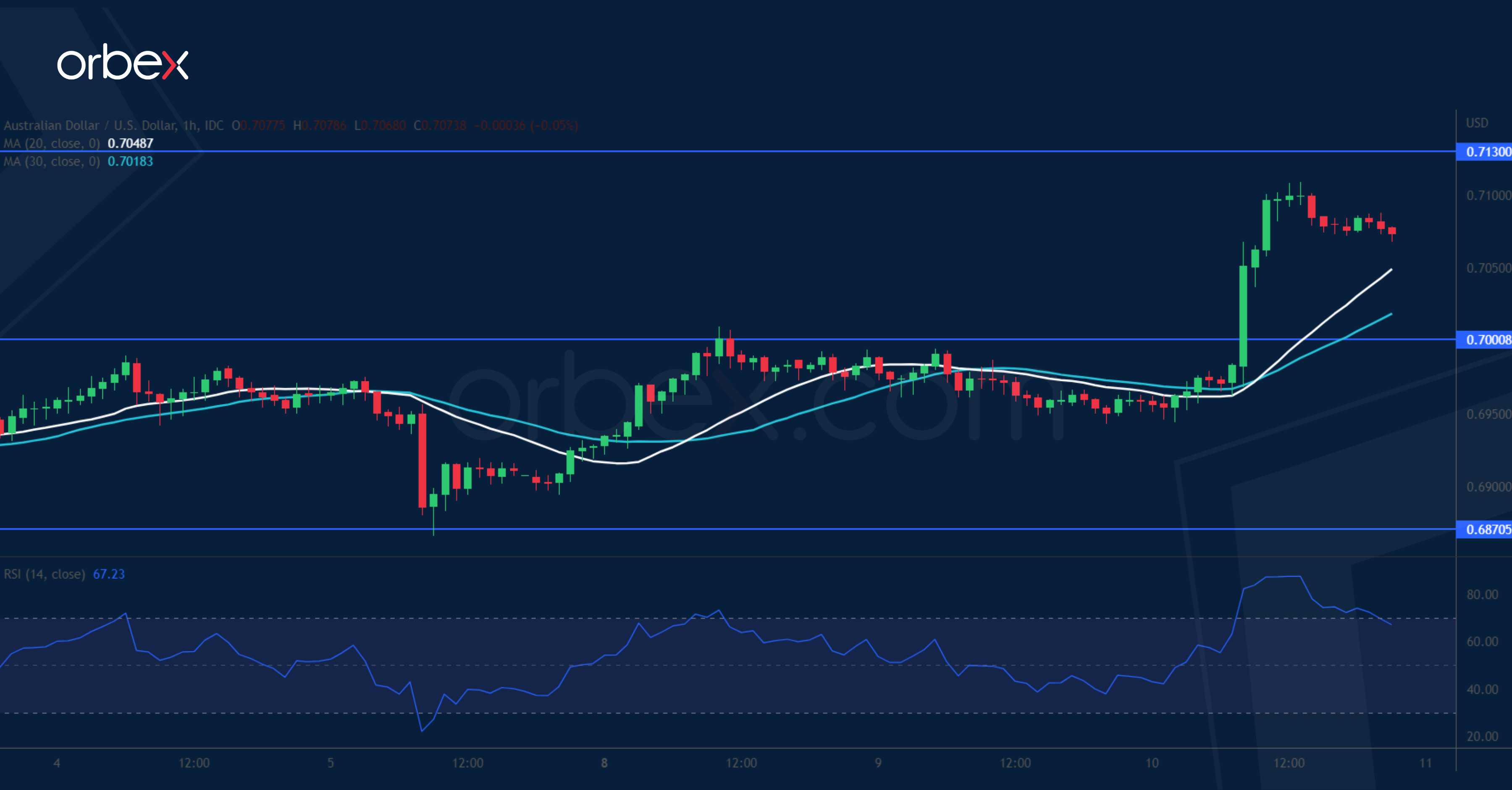 ارتفع الدولار الأسترالي في وقت دفع فيه ضعف نظيره الأمريكي المتداولون نحو الأصول ذات المخاطر العالية. وبعد التراجع القصير، ارتد الزوج من منطقة الطلب قرب ٠.٦٨٧٠ الواقعة مباشرة أعلى تقاطع المتوسط المتحرك الصاعد على الرسم البياني اليومي. ويشير تجاوز الزوج للمقاومة اليومية عند ٠.٧٠٥٠ إلى رغبة المشترين في الارتفاع. ويمثل ٠.٧١٣٠ العقبة التالية امام الارتفاع حيث عكس مؤشر القوة النسبية حالة ذروة الشراء. ويمكن أن يؤدي اختراقه إلى تمهيد الطريق للارتفاع نحو قمة يونيو عند ٠.٧٢٧٠. في حين أن المستوى النفسي ٠.٧٠٠٠ يعد الدعم الأول و٠.٦٨٧٠ واجب صموده للحفاظ على الانتعاش قائماً.
