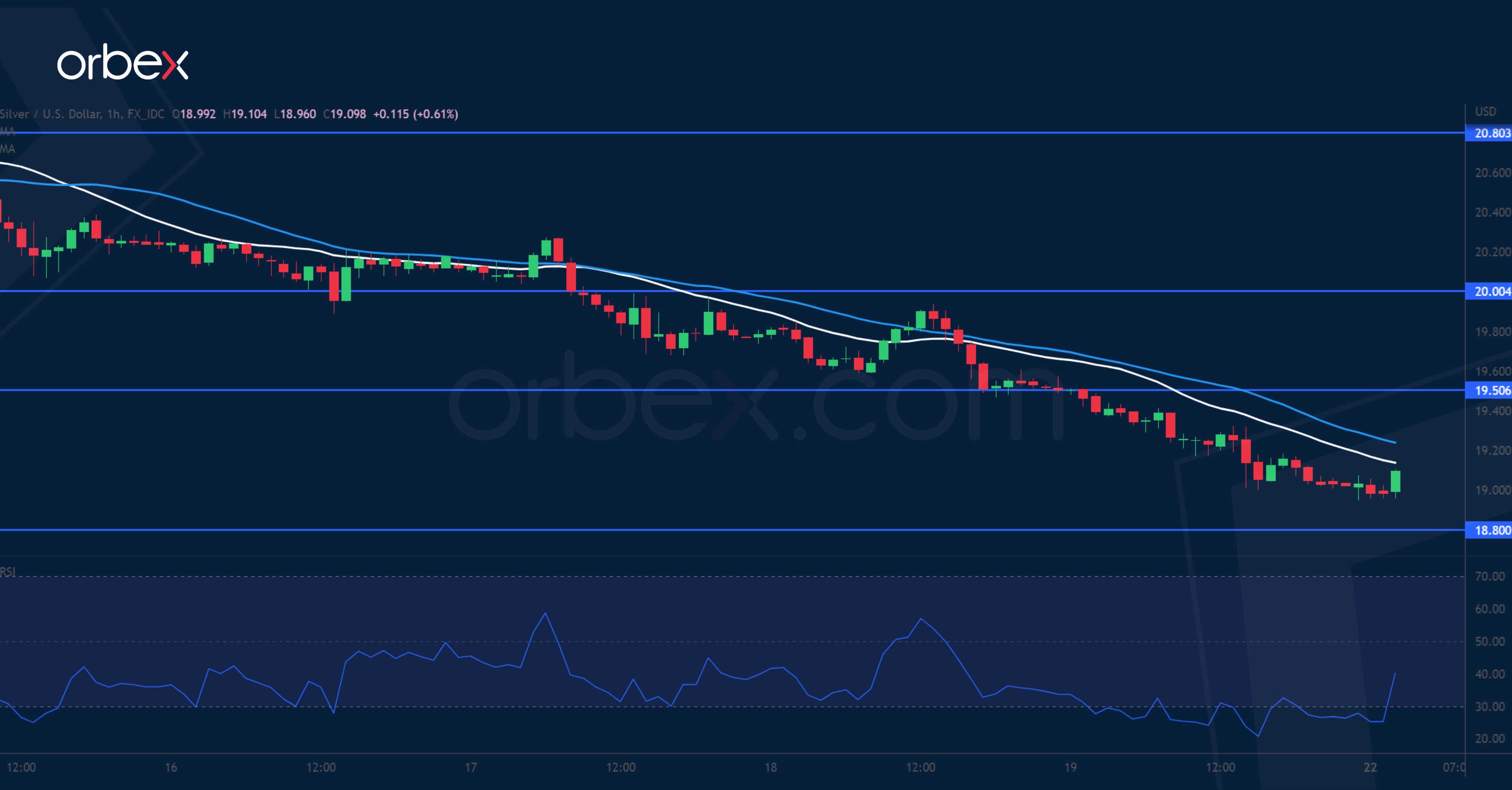 تنخفض الفضة مع تعافي الدولار الأمريكي بشكل عام. وعكست حركة السعر مسارها على الرسم البياني اليومي، عند الدعم الذي تحول إلى مقاومة ٢٠.٨٠. ويشير الانخفاض إلى ما أسفل أدنى المستويات السابقة عند ١٩.٦٠ إلى عدم وجود متابعة للمعدن وأثار موجة من عمليات جني الأرباح. ويعتبر المستوى ١٨.٨٠ عند قاعدة الاختراق الصاعد للشهر الماضي مستوى هام لمعرفة ما إذا كان لا يزال هناك مشترين للمعدن. وإلا فقد يدفع البائعون بالسعر إلى ما دون ١٨.٢٠. ومع تعمق مؤشر القوة النسبية في منطقة ذروة البيع، فإن ١٩.٥٠ يمثل مقاومة جديدة في حال حدث ارتداد.