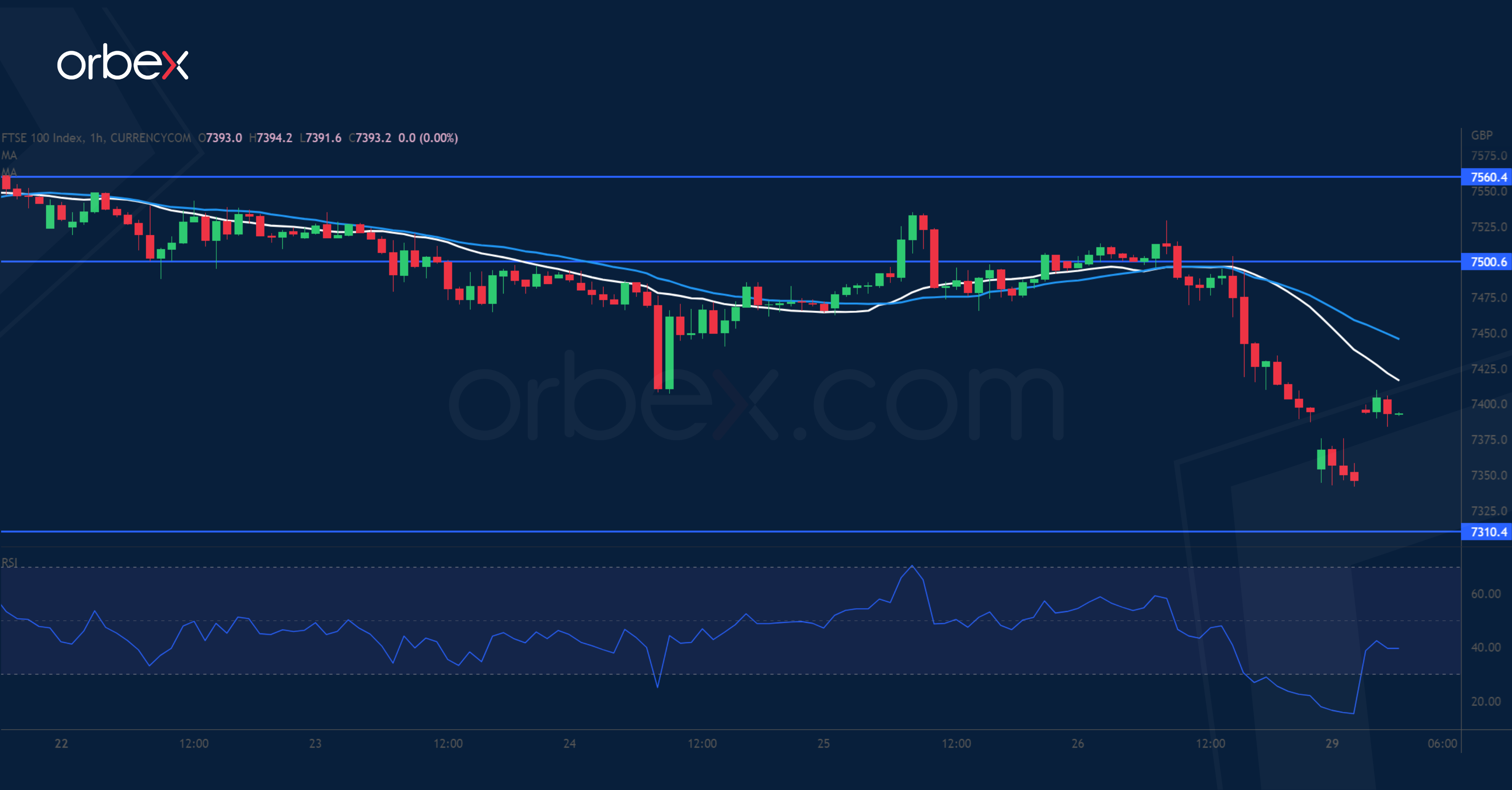 لا زالت الأسهم تحت وطأة الضغط فيما يستعد المستثمرون لمزيد من الرفع القوي للفائدة من قبل البنوك المركزية. وفقد مؤشر “فوتسي ١٠٠” زخمه مع اقترابه من القمة الثلاثية ٧٦٥٠ من الرسم البياني اليومي. وتسبب الانخفاض المبدئي دون ٧٤٦٠ ببعض عمليات جني الأرباح. ومن ثم أدى الاختراق إلى ما دون ٧٤٠٠ بإنهاء آخر ارتداد ليجبر ذلك المشترين على الانسحاب. ويقع الدعم الأقرب عند ٧٣١٠، وقد تتسبب حالة ذروة البيع لمؤشر القوة النسبية في ارتداد محدود. وقد يتعرض المؤشر لجولة أخرى من التصفية ما لم يتمكن المشترين من استعادة المستوى ٧٥٠٠.