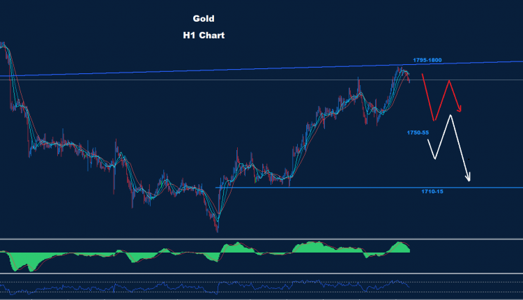 طالما أن السوق مستقر تحت منطقة المقاومة 1795-1800 فإننا نتوقع بعض الحركة الهبوطية حيث يتواجد الدعم عند 1774 و 55-1750 والتي قد تحتفظ بمنطقة تداول على الذهب