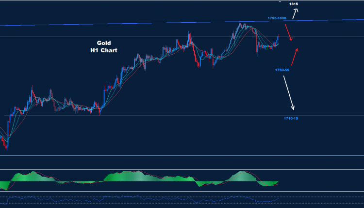 كما نرى خلال الرسم البياني، يدخل الذهب الآن منطقة تداول بين المقاومة 1795-1800 والدعم 55-1750
