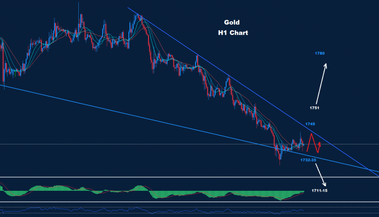 يظهر الذهب من خلال مستويات التداول اليومي منطقة تداول ضيقة بين 1732 و 1745.