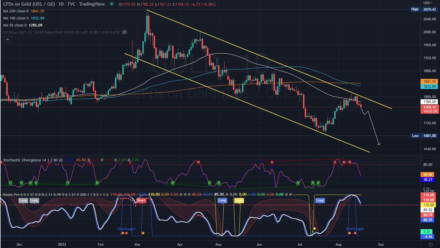 من المتوقع أن تزداد الضغوط البيعية على الذهب طالما استقرت التداولات أسفل الحد العلوي للقناة السعرية الهابطة أسفل المستوى 1805$ ومن المتوقع أن يمتد التراجع الحالي إلى المستوى 1750 و 1700$.
