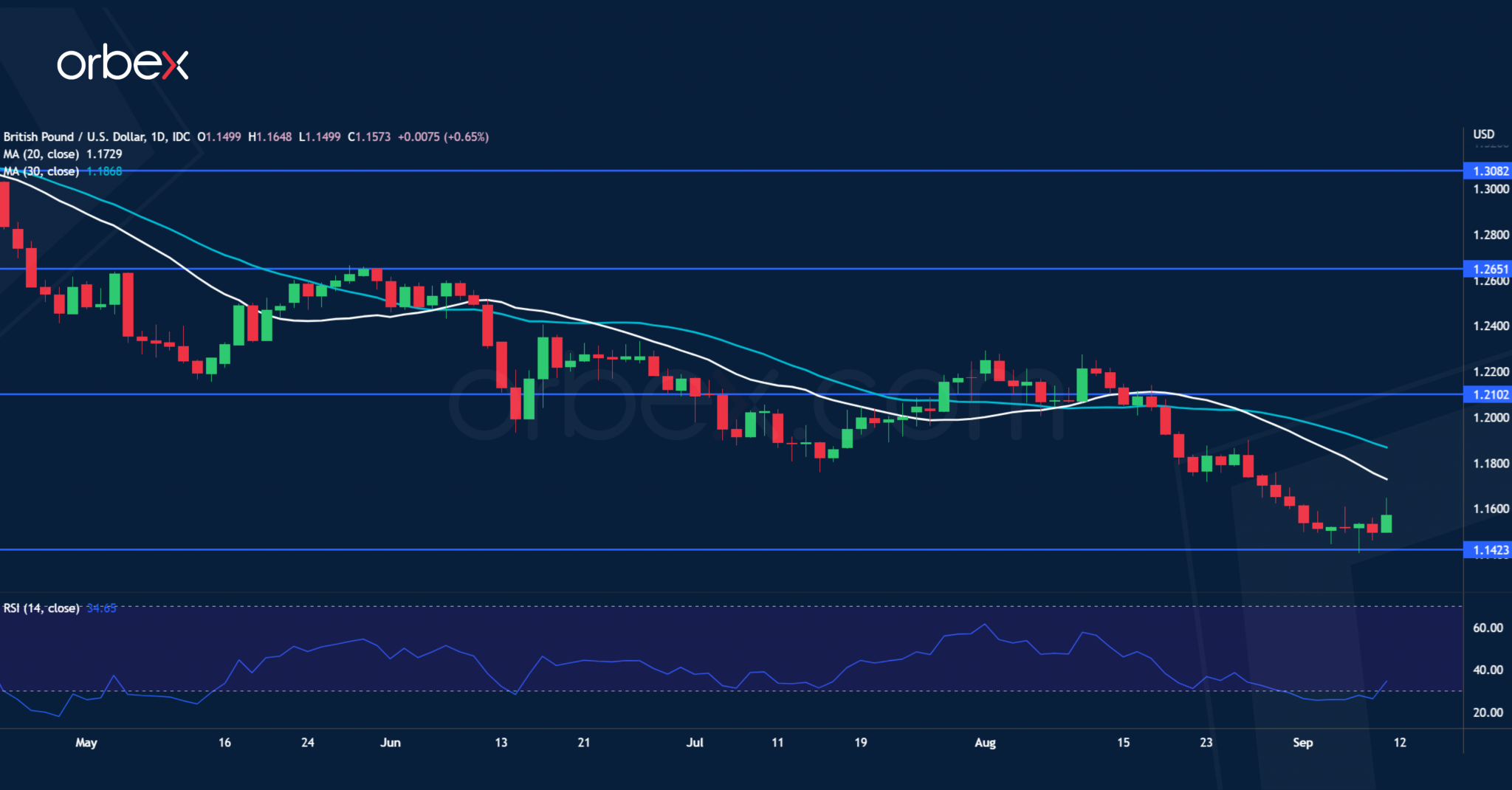 يعاني الجنيه من أعراض ارتفاع التضخم وارتفاع أسعار الفائدة. ولم تنجح التوقعات برفع قوي لأسعار الفائدة من قبل بنك إنجلترا في إقناع المتداولين الذين يميلون إلى الابتعاد عن الأصول الخطرة. ويشكل كل الركود والانفاق الحكومي المتزايد وأزمة الطاقة رياحاً معاكسة قوية تواجهها بريطانيا. وتخشى السوق من أن تؤدي الزيادة بمقدار ٥٠ نقطة أساس فقط لإضعاف ثقة المستهلك والشركات وتعريض النمو للخطر، وهي تكلفة باهظة لكبح التضخم. ونجد في ذات الوقت الدولار الأمريكي مدعوم باقتصاد قوي وجاذبيته كملاذ آمن، ما يعني أن الضعف قد يبقى مسيطراً على الجنيه الإسترليني. ويعد ١.١٤٢٠ دعماً مهماً من مارس ٢٠٢٠ والمقاومة الأولى عند ١.٢١٠٠.