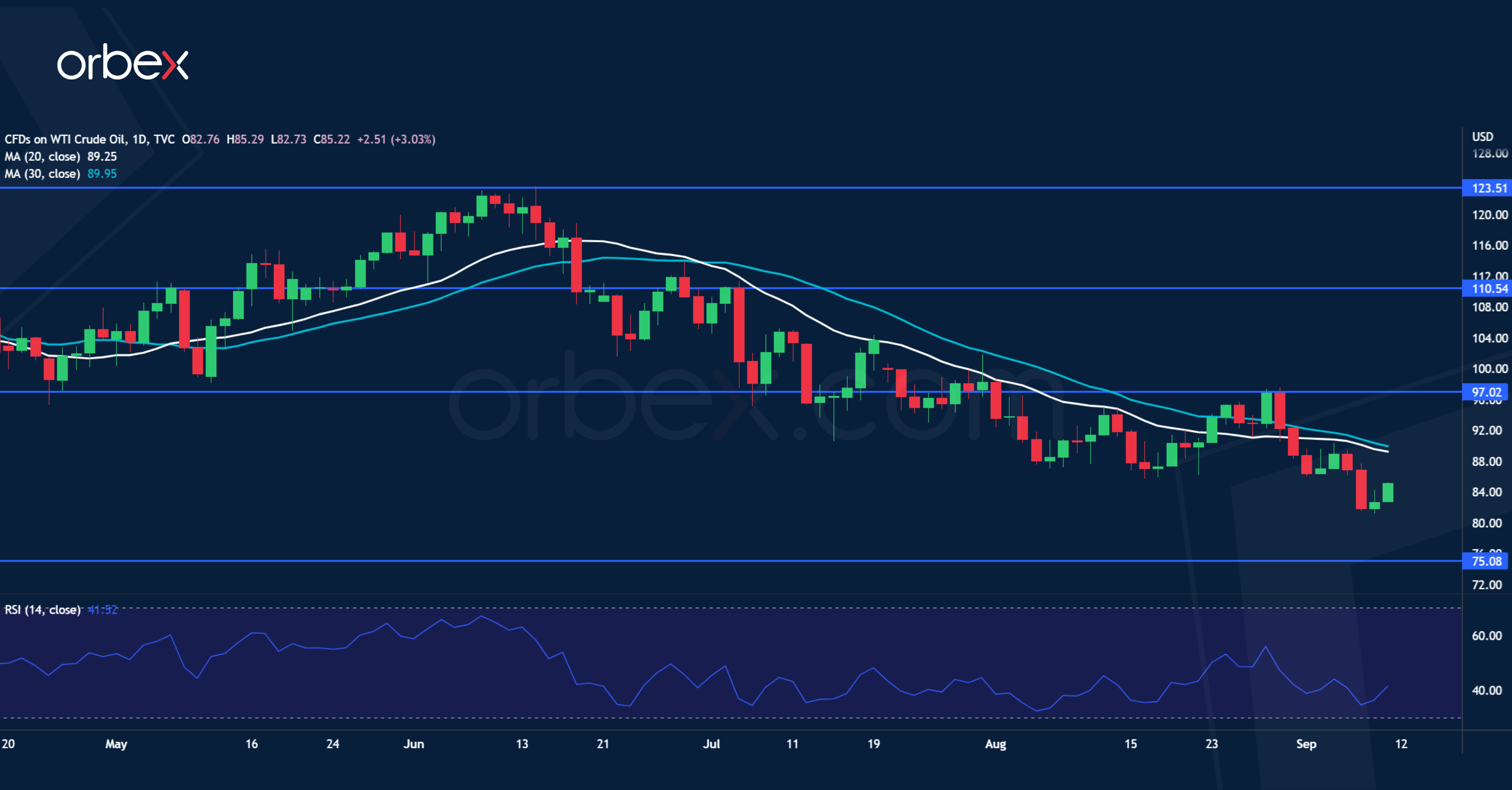 تتراجع أسعار خام غرب تكساس الوسيط مع خشية المتداولون من قرب حدوث ركود اقتصادي. وتشير أرقام التجارة الضعيفة في أغسطس من الصين إلى المزيد من المعوقات لانتعاش الاقتصاد العالمي. وفقدت الصادرات زخمها بسبب ضعف الطلب من الولايات المتحدة والاتحاد الأوروبي في الوقت الذي تؤثر فيه عمليات الإغلاق المحلية وضعف ثقة المستهلك على الواردات. وقد يؤدي تباطؤ النمو في الصين، ثاني أكبر مستهلك للنفط، إلى إبقاء السوق على أهبة الاستعداد لمرحلة الركود. فإن الضغط الدؤوب الذي تمارسه البنوك المركزية الكبرى من أجل تشديد الشروط المالية لمكافحة التضخم قد يكون بمثابة القشة التي قصمت ظهر البعير، الأمر الذي يجعل الركود حقيقة واقعة. ويمكن أن الحد الأقصى للسعر عند ٩٧.٠٠ ويتجه نحو ٧٥.٠٠.