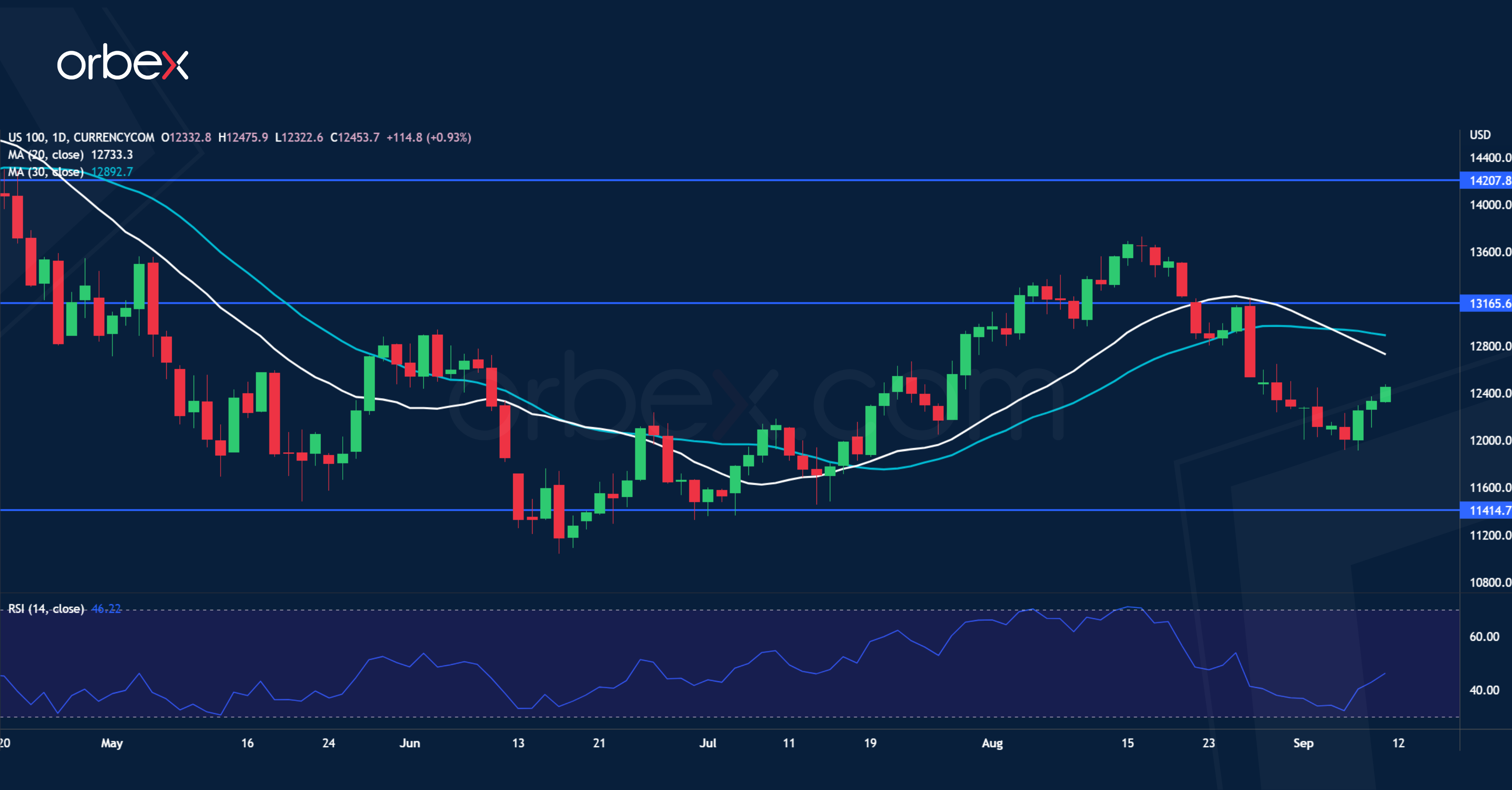توقف ارتفاع مؤشر ناسداك ١٠٠ مع احتمالية تأثير تحقق ركود طويل الأمد على الأصول ذات المخاطر. ومن المتوقع أن يرفع بنك الاحتياطي الفيدرالي أسعار الفائدة بمقدار ٧٥ نقطة أساس أخرى في اجتماعه في سبتمبر. ومع تزايد علامات التباطؤ الاقتصادي في أوروبا والصين، يتساءل المستثمرون عما إذا كانت البنوك المركزية قد تضغط بشدة وتعصف بالاقتصاد العالمي. وقد يستمر تزامن الانكماش العالمي والتشدد الفيدرالي في كبح حماس أي شخص في الأسهم الحساسة للنمو. وتكمن مخاطر الهبوط في انها قد تعود بالمؤشر إلى ما دون الدعم الجوهري ١١٤٠٠، أي محو كل الارتفاع الذي حدث في يوليو، مما يؤكد على هبوط السوق. أما المستوى ١٣١٦٠، فهو مستوى مقاومة جديد.