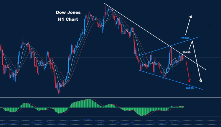 كما نرى على الرسم البياني اللحظي، يواجه السوق مقاومات حول 29490 و29700 حيث قد تدفع إحدى تلك المقاومات السوق لحركة هبوط أخرى باتجاه منطقة 28750.