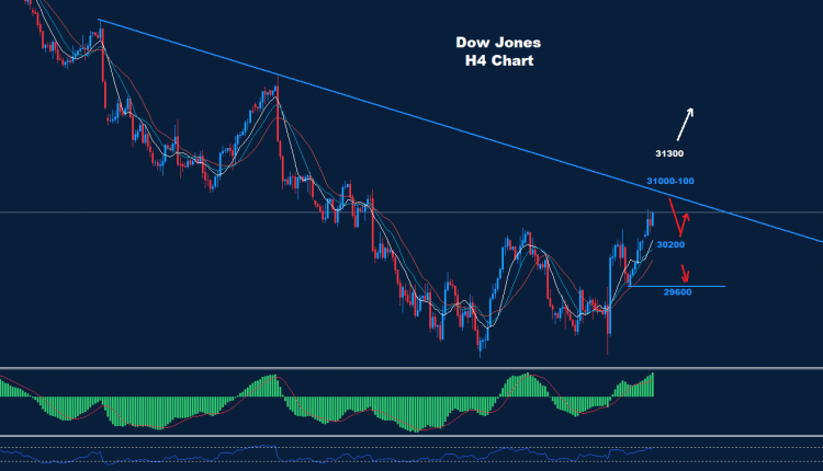 لا يزال مؤشر داو جونز يحتفظ بالتداولات تحت ترند الاتجاه الهبوطي 100-31000 بينما تمكن السوق حتى الآن من الوصول إلى أعلى مستوى حول 30840.