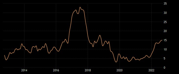 فقد تسارعت معدلات التضخم في مصر إلى 15% خلال شهر سبتمبر مقارنة بـ 14.6% خلال أغسطس، وهي أعلى قراءة للتضخم منذ نوفمبر 2018 وأعلى من النطاق المستهدف من البنك المركزي فيما بين 5-9% لسبعة شهور متتالية. وذلك وسط ارتفاع أسعار السلع العالمية وهبوط قيمة الجنيه المصري.