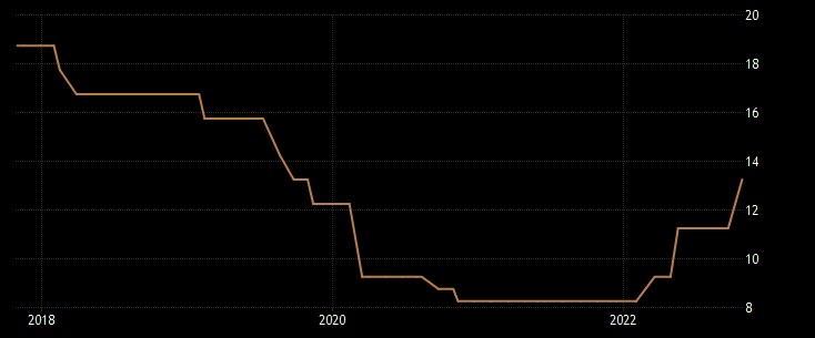 كما رفع المركزي سعر العملية الرئيسية للبنك بواقع 200 نقطة أساس لتصل إلى 13.75%.