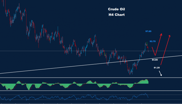 تمكن النفط الخام من الحفاظ على التقدم نحو المقاومة 92.70 وما فوق بعد تخفيض العرض عن طريق أوبك+ حينها.