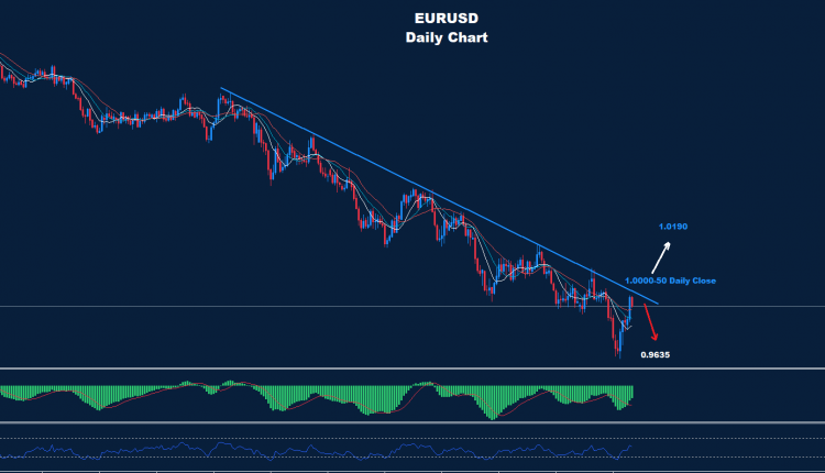 كما نرى على الرسم البياني اليومي، يشير المدى القصير إلى وجود خط ترند للمقاومة حول منطقة 50-1.0000 حيث طالما استمر اليورو في الإغلاق اليومي دون هذا الترند، فقد تضرب السوق فرصة لحركة هبوط أخرى نحو مستويات 0.9635.
