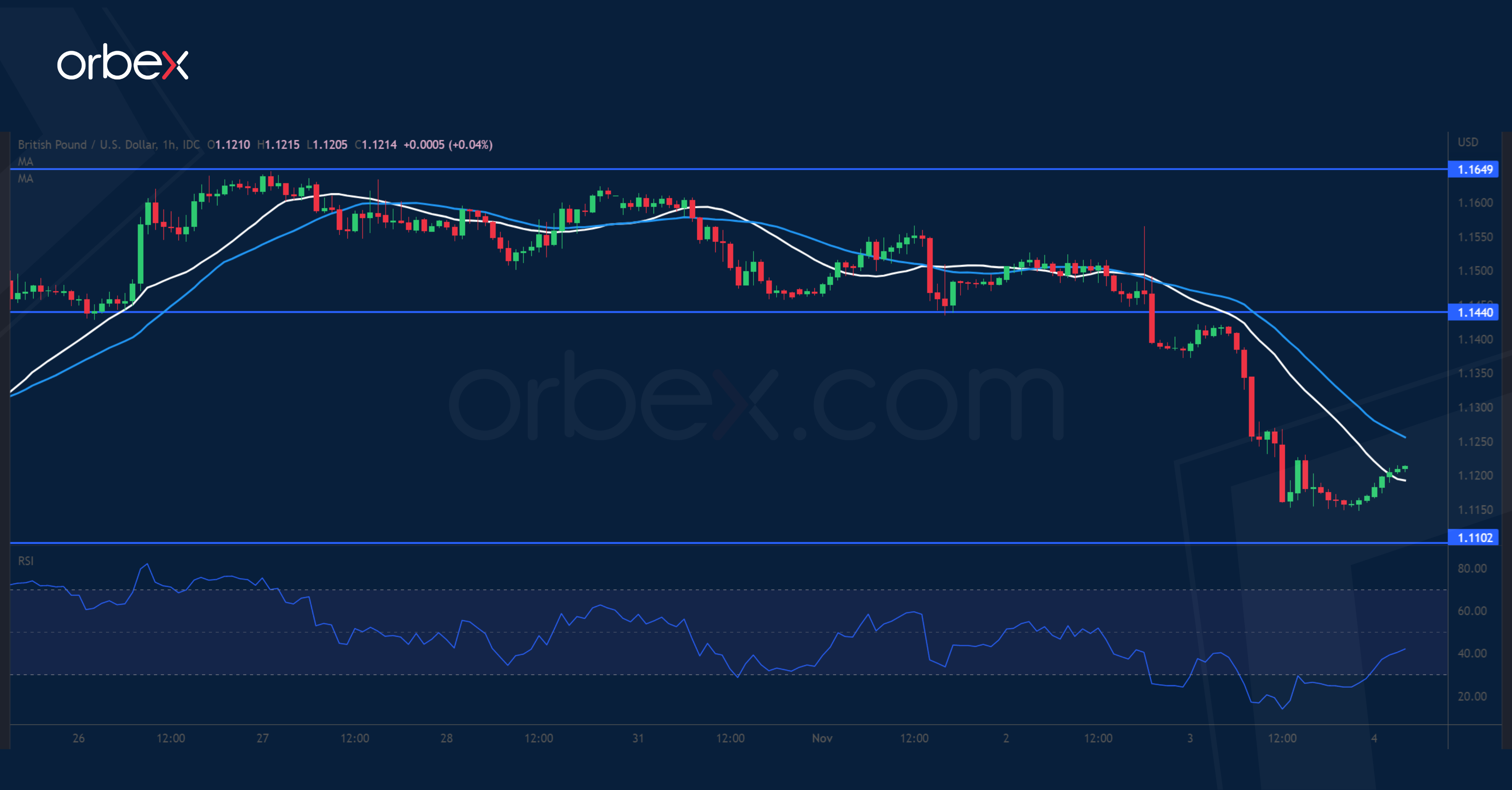 انخفض الجنيه مقابل الدولار الأمريكي بعد أن حذر بنك إنجلترا من انكماش طويل الأمد. وفقد السعر قوته بالقرب من قمة شهر سبتمبر عند ١.١٧٠٠، ودفع هبوط السعر ما دون ١.١٤٤٠ دفع المشترين للتغطية، ليتحول المستوى إلى مقاومة. ويعد غياب العروض عند قاعدة الاختراق الصاعد الأخير التي يمثلها المستوى ١.١٣٠٠ بمثابة إشارة تحذير على أن المعنويات قد أصبحت حذرة. ويعتبر المستوى ١.١١٠٠ دعمًا مهمًا، وبعد تعمق مؤشر القوة النسبية في منطقة ذروة البيع، يمكن توقع سلوك “شراء الانخفاضات”. إلا أن كسر هذا المستوى قد يجعل الجنيه الاسترليني عرضة لتجدد ضغوط البيع.