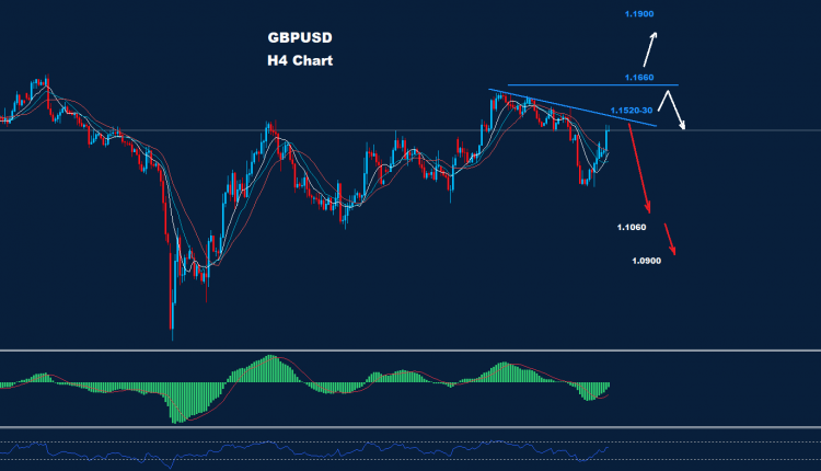 كما نرى في الرسم البياني، يقترب السوق من المقاومة 30-1.1520 مما قد يدفع لموجة هبوط أخرى نحو 1.1060 و1.0900.
