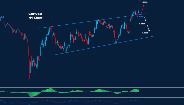 كما نرى على الرسم البياني، تظهر المستويات خلال اليوم دعماً حول 1.1700 حيث طالما استمر تداول السوق فوق هذا المستوى فإن الموجة المتقدمة ستستمر نحو 1.2070.