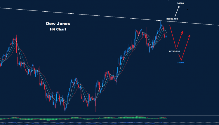 كما نرى على الرسم البياني ، فإن أي ارتداد في السوق سيعطي فرصة لموجة هبوط أخرى نحو منطقة 850-31700 طالما استمر السوق في الحفاظ على التداولات أسفل منطقة المقاومة 460-33360