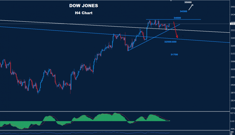 تمكن مؤشر الداو من الاحتفاظ بالتداولات تحت المقاومة 34000 حيث تمكن من تحقيق الهدف الأول لمنطقة 33300.