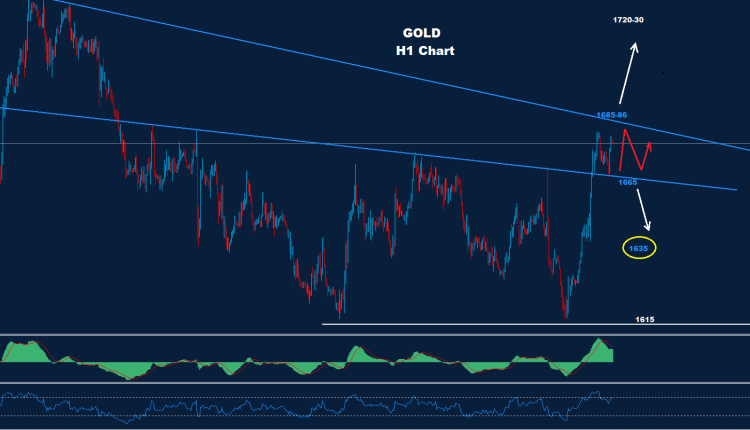 كما نرى على الرسم البياني، فإن الذهب يحتفظ بالتداولات داخل منطقة تداول محتملة بين الدعم 1665 والمقاومة 86-1685.
