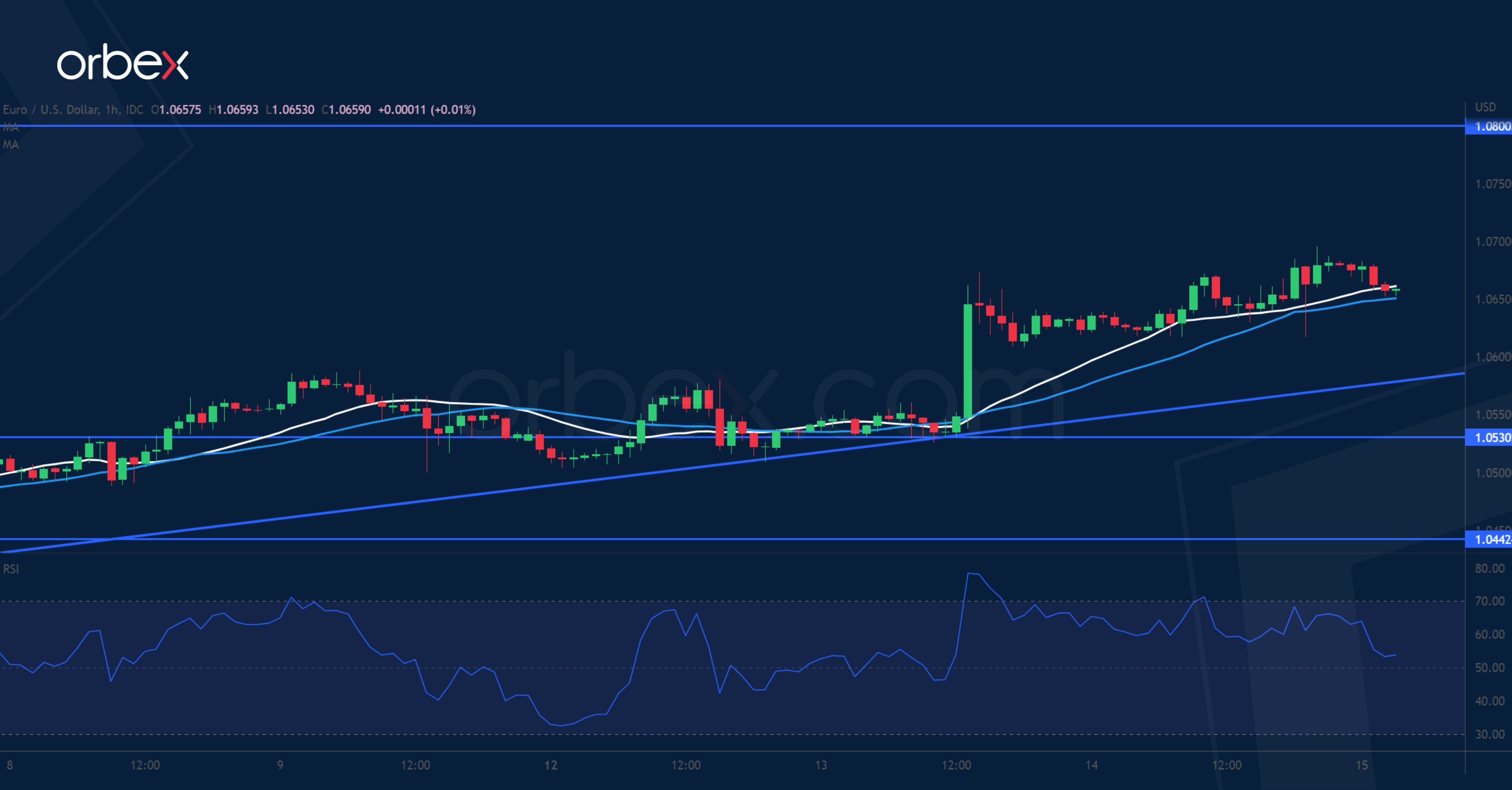يستقر اليورو مقابل الدولار الأمريكي قبل صدور قرار البنك المركزي الأوروبي الخاص بالفائدة اليوم. ويظهر الرسم البياني اليومي، توجه الزوج نحو أعلى مستوى كان قد سجله في مايو الماضي عند ١.٠٨٠٠، وذلك بعد الارتداد عن المستوى ١.٠٣٠٠٠ الواقع على المتوسط المتحرك لمدة ٢٠ يوماً. وبالتدقيق في الإطار الزمني للساعة، كان اليورو يرتفع على طول خط الاتجاه الصاعد، فيما يوجد مستوى الدعم الجديد عند قاعدة الزخم الأخير ١.٠٥٣٠. وقد يستمر المزاج المتفائل في دفع حركة السعر للأعلى، ولكن قد يزداد ضغط البيع مع اقتراب الزوج من منطقة العرض حيث قد يبدأ المشترون على المدى القصير في جني الأرباح.
