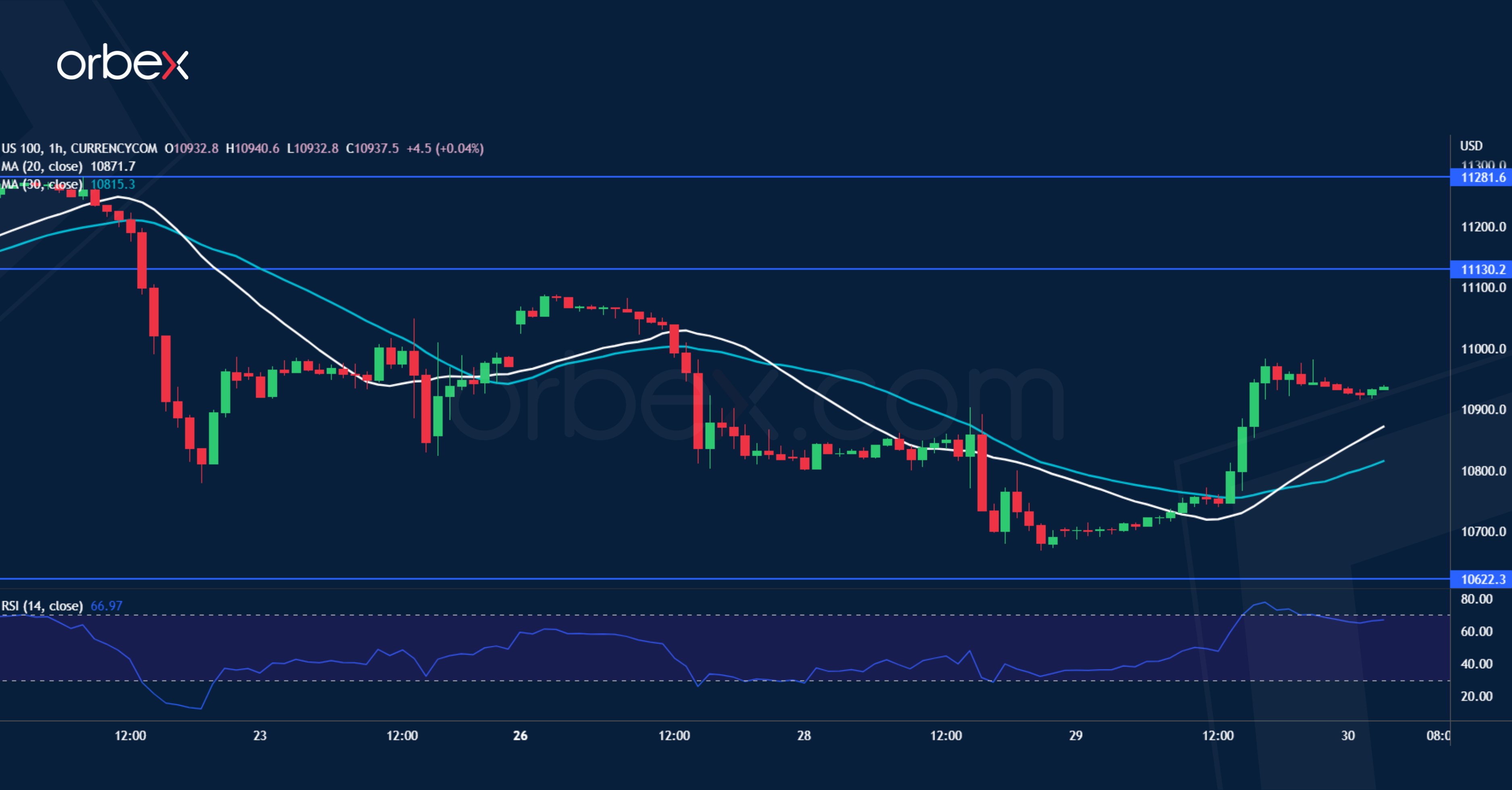 ارتد مؤشر ناسداك 100 في ضوء المعطيات التي عكست أن سوق العمل الأمريكي الهادئ قد خفف من حدة المخاوف بشأن تفاؤل بنك الاحتياطي الفيدرالي. وعلى الرسم البياني اليومي، كان التحول من نقطة البيع في منتصف سبتمبر (12200) أمراً مثير للقلق. وفي ظل عودة المؤشر مجدداً إلى مستوى 10620 أعلى مستوياته في نوفمبر، فمن المحتمل أن يتعرض “ناسداك” إلى عمليات بيع متجددة. وفي حال كسره دون مستوى 10450، فسيدل ذلك على ارتداد خافت وسيتسبب ذلك في استدامة السوق الهابطة. وتجدر الإشارة إلى أن أول مستوى مقاومة يستهدفه المؤشر هو 11130. ويعتبر 11280 مستوى قوي يجب أن يخترقه المؤشر قبل أن يسيطر المشترين على السوق.