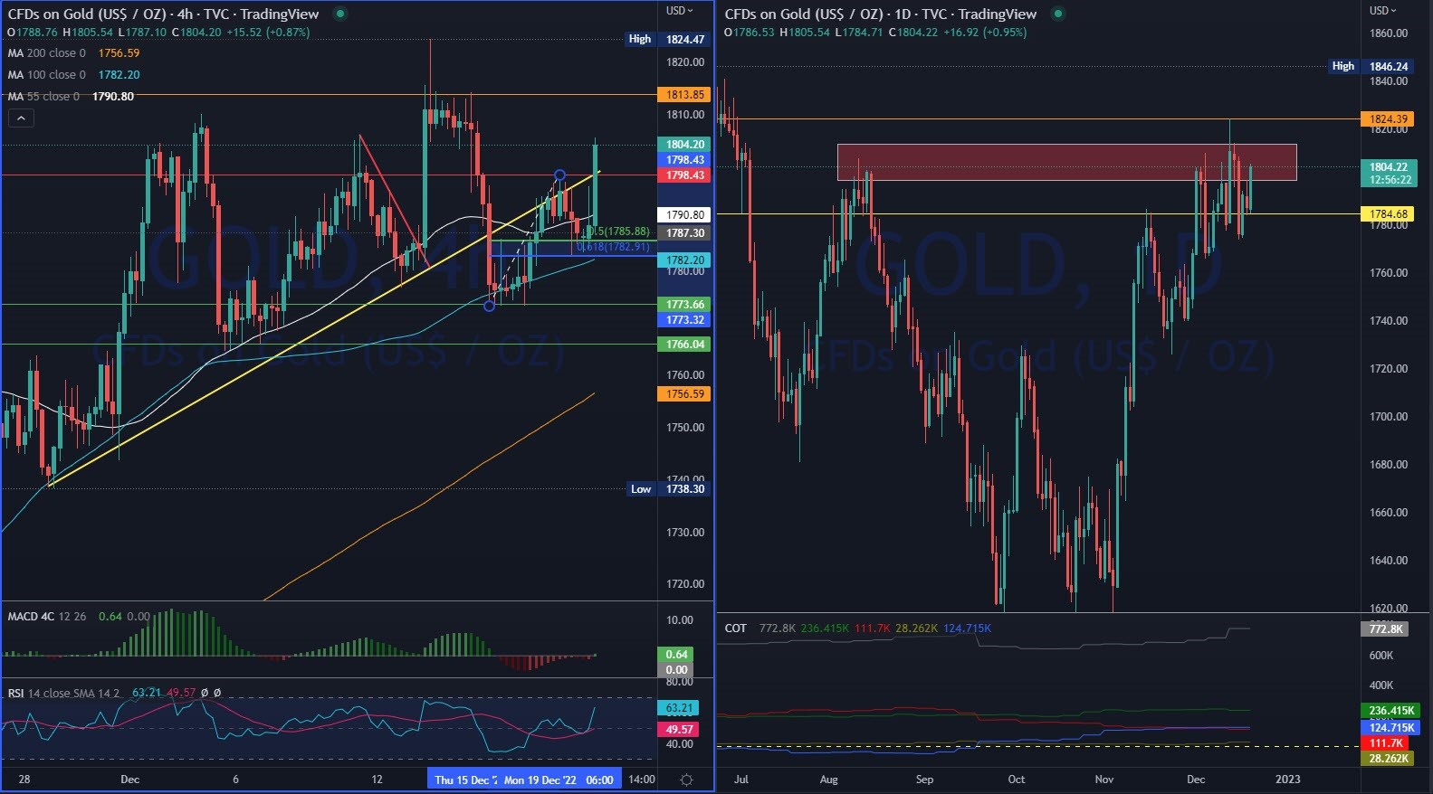 تخلص الذهب من الضغوط البيعية التي تعرض لها منذ قرارات الفيدرالي الأمريكي ليجري تداوله حاليًا قرابة المستوى 1802$ وذلك بعد استقرار تداولاته أعلى مستوى الدعم على المدى المتوسط 1773$.