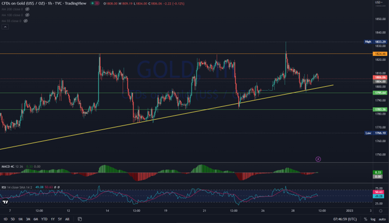 ويلاحظ وجود مقاومة عند المستوى 1810$ بينما يستقر الدعم عند 1800$ ويليه 1795$.