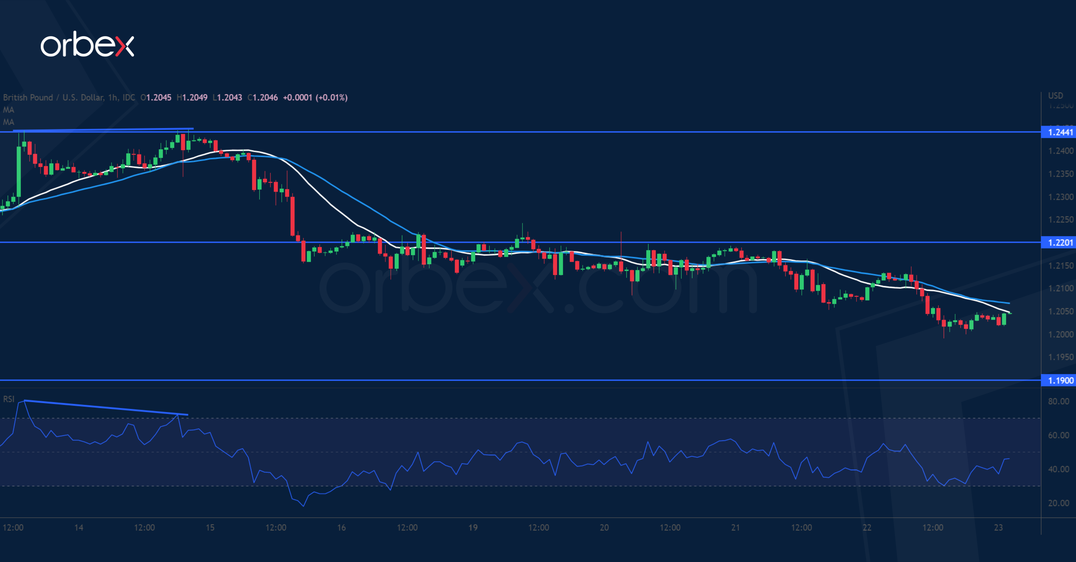 واصل الجنيه الإسترليني تراجعه على خلفية بيانات إجمالي الناتج المحلي البريطاني السلبية عن الربع الثالث من 2022. وعكس مؤشر المتوسط المتحرك الهابط أن الضغط الشرائي الذي تعرض له الزوج سابقاً بدأ يتلاشى. وكان قد كسر زوج الإسترليني/دولار دون المستويات 1.2200 و1.2100؛ المستقران عند المتوسط المتحرك لـ 20 يوماً.