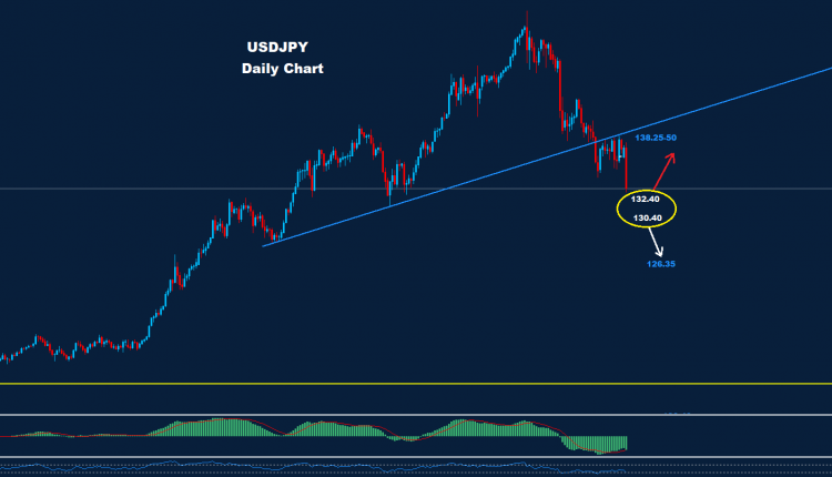 يظهر الرسم البياني اليومي منطقة دعم عند 130.40 – 132.40 مما قد يفسح المجال لبعض التصحيح الارتدادي نحو 134.50 و 136.00