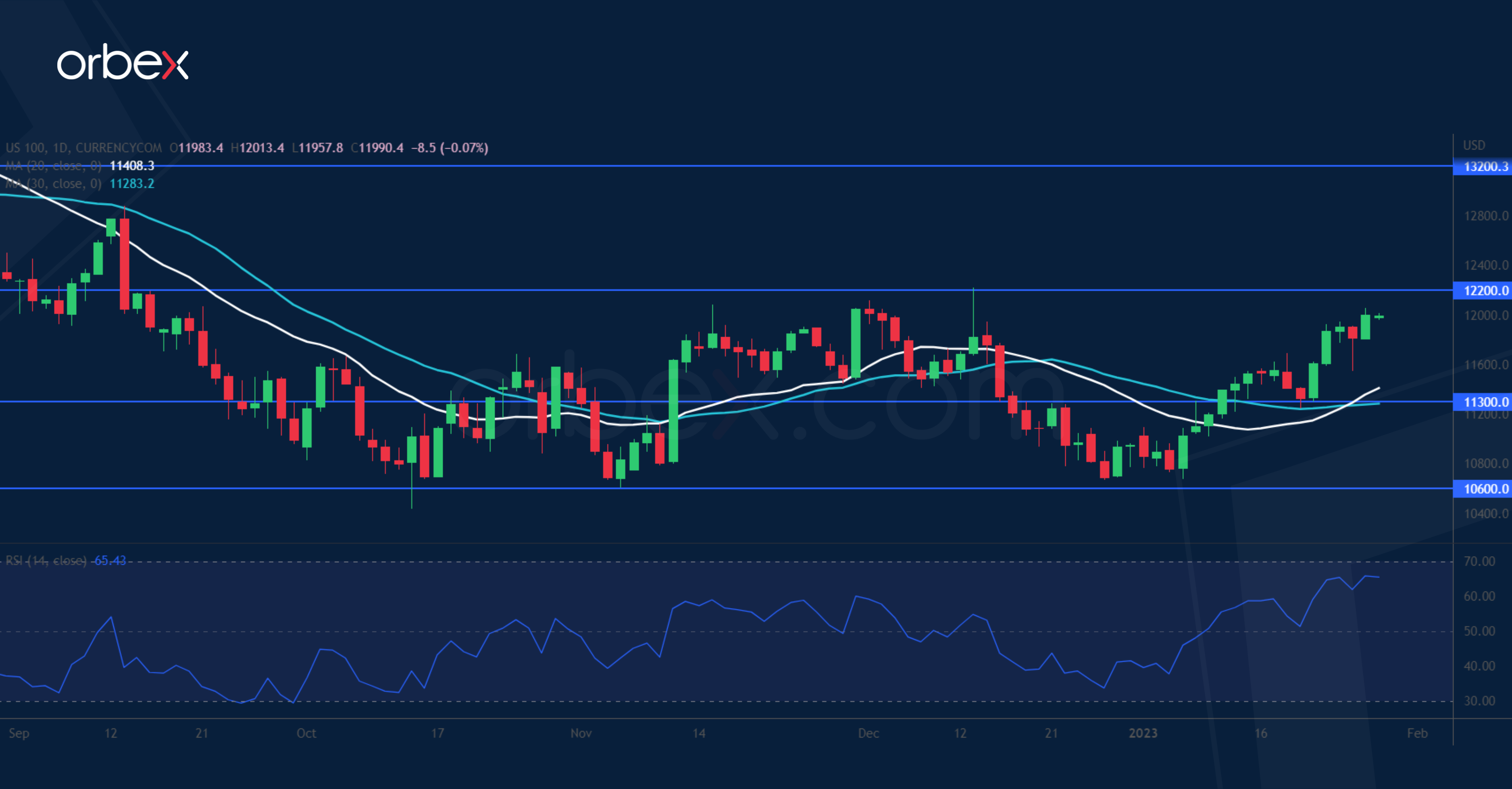 يرتفع مؤشر ناسداك ١٠٠ مع انحسار مخاوف الركود في ظل نتائج بيانات اقتصادية مشجعة. والواقع أن المؤشرات الأخيرة جعلت المستثمرين يدركون أن الأمور ليست بهذا السوء وأن تركيبة من النمو الموائم وتخفيف الأسعار قد تشكل المزيج المناسب للهبوط السلس. وعلي الرغم من عدوانية بنك الاحتياطي الفيدرالي، فإن حديث البنوك المركزية الرئيسية الأخرى عن إيقاف دورات رفع الفائدة يساهم بكل تأكيد في تلاشي بعض التشاؤم. ومع تسعير السوق لزيادة أقل بمقدار ٢٥ نقطة أساس في اجتماع بنك الاحتياطي الفيدرالي المقبل، ساهم هذا التسعير ارتفاع شهية المخاطرة في الأسابيع القليلة الماضية. ويتواجد مستوى المقاومة المباشر عند ١٢٢٠٠، بينما يقع الدعم الأول عند ١١٣٠٠.
